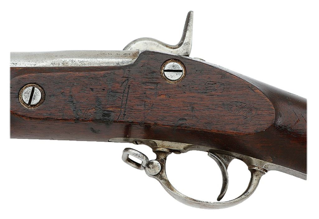 .58 cal., 38'' barrel with a bright fine bore showing some light oxidation at the muzzle and strong rifling throughout. Only about 2500 Model 1858 Cadet Rifle-Muskets were produced at Springfield Armory, making surviving examples scarce, while nice condition examples such as this one are rare. The metal surfaces of this Model 1858 Type I are toning to a lightly mottled gray patina with overall speckles of softened pinprick pitting and old light oxidation, a few tiny impact marks along the barrel, and some fine cleaning striations. The brass forend cap is toning to a warm goldenrod patina. The barrel and lockplate markings are correct and clear with both dated 1858. The Maynard primer mechanism is intact and functional. The walnut stock rates near fine with a scratch on the right side of the heel, a thin chip missing ahead of the lockplate, and other scattered minor dents, dings, and handling marks. The left stock flat bears strong ''ESA'' and ''JS'' cartouches and a softened ''S'' inspection mark is behind the lower tang. The original sights including the correct Model 1855 rifle-musket sight are intact, a correct cupped tulip-head ramrod with threaded end are included, and the action is strong and crisp. A fine condition example of these scarce and collectable cadet rifle-muskets. (23B11346-23) {ANTIQUE} (4000/6000)