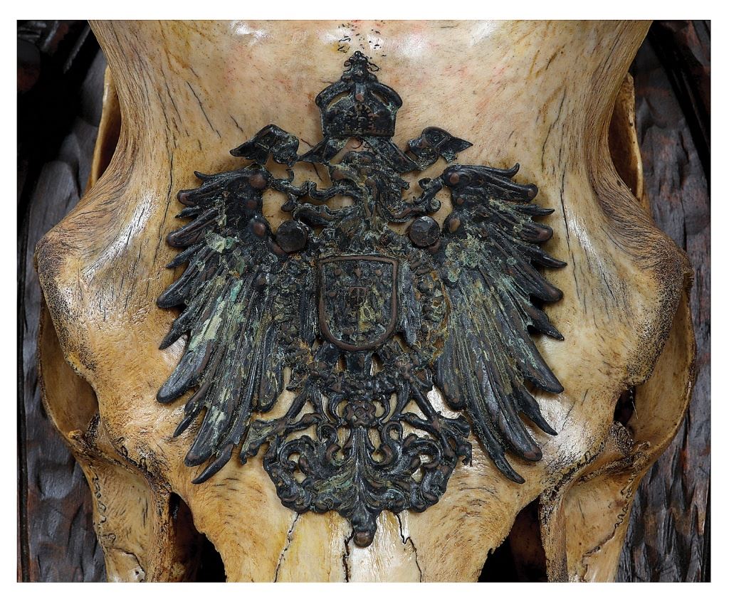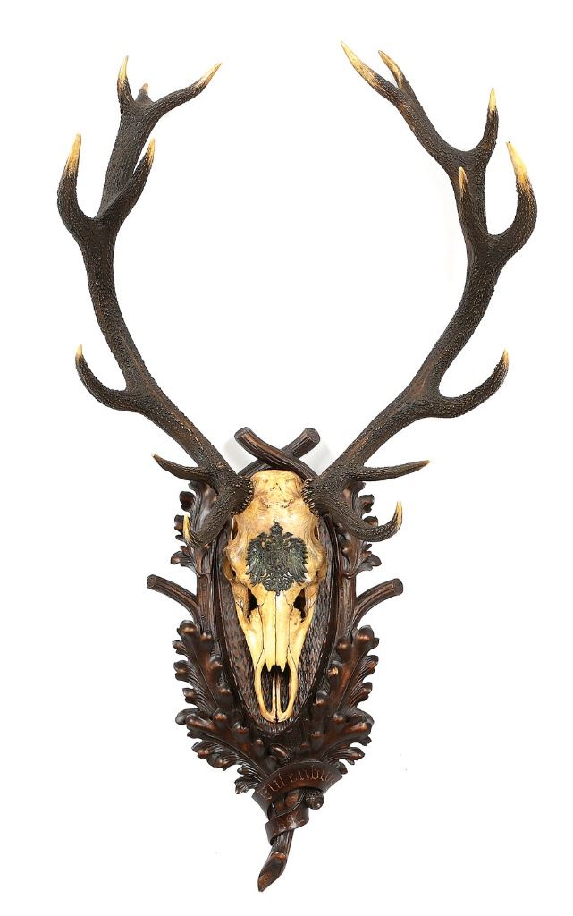 This and many other impressive mounts were liquidated some time ago by members of the Hohenzollern royal family, the pieces originating from the Eulenburg family estate of Liebenberg Castle in Brandenburg, one of Kaiser Wilhelm's favorite hunting preserves. The mount is quite attractive and of course in European style remaining in near excellent condition showing a pleasant rich patina along the skull and polished tips of the rack, the rugged bark a dark brown tone. A fine blackened bronze Imperial German coat of arms is nailed to the skull and shows some mild tarnishing and verdigris forming. The span is about 27 1/2'' with a height of about 29''. The mount is affixed via a steel bracket on the back with a pair of screws and is currently somewhat loose and the back also shows a paper tag numbered ''13'' and what appears to be a label of the craftsman who did the work, this showing some light flaking. The carved base appears to be dark stained maple or oak and is in lovely form featuring bold carved oak leaves, branches and acorns with riband along bottom with contrasting inlaid wood in fancy script ''Eulenburg / 1892''. The base rates very fine showing one small chip along the edge of the right branch, some scuffs and light handling marks. The base measures about 30 1/2'' high by 18'' wide. A very fine, attractive and historic mount from the German Royal Family holdings. [Extra Shipping Will Apply, Pick-up Recommended] (13C11108-131) [Tom Devers Collection] (4000/6000)