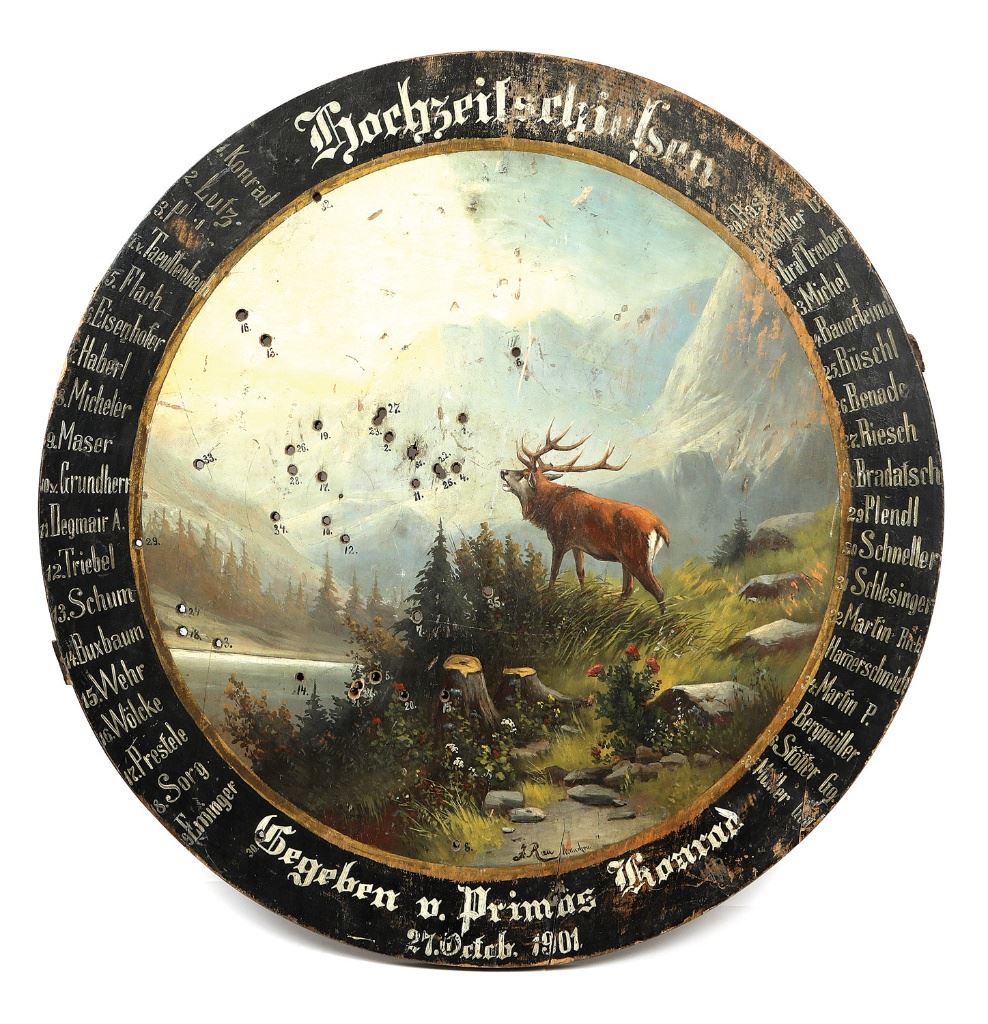 This is a very attractive painted target measuring 29'' featuring a fine mountainous scene with majestic bellowing red stag and retaining quite crisp imagery and colors showing some light flaking, scuffs and dings to be expected. The painting is signed by J. Rau of Munich and the target consists of a single shot from 37 different shooters, no doubt this was a fairly long range target and the impacts all appear to be from the ubiquitous 8.15x46R cartridge. There are a few splits and cracks in the target but it remains very sound overall. Each impact is numbered to its corresponding shooter whose names are painted along the edges of the target while the top edge shows ''Hochzeitschiessen'' (celebratory wedding shoot) and the bottom edge shows ''Gegeben v. Primus Konrad / 27.Octob.1901''. The back side also has the impacts numbered in pencil (probably done on a preliminary basis by the scorer) and Konrad's name in pencil along the top and Konrad was also the first shooter and, logically, probably the one getting married. This is a wonderful target for the advanced schuetzen collector. (13A11108-132-1) [Tom Devers Collection] (700/900)