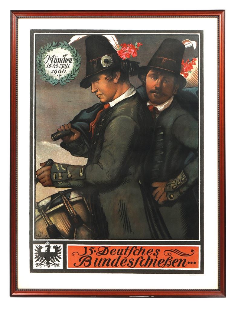 This fine poster has been nicely framed and measures about 34 1/4'' x 45 1/2'', with the mounted poster itself, the frame and glass rating excellent. The color lithograph poster shows just a few sparsely scattered small areas of minor foxing and crinkling that is really only noticeable upon close inspection. It is advertising the 15th Deutsches Bundesschiessen held in Munich from July 15-22, 1906 and depicts two traditional German fellows, the man in front with a drum. The image and colors are excellent with artist's signature ''JOS. SAILER.'' (Josef Andreas Sailer, 1872-1952). The lithograph was printed by Dr. C. Wolf & Sohn of Munich. This is an excellent piece for the German arms or schuetzen collector. [Extra Shipping Will Apply, Pick-up Recommended] (13A11108-128) [Tom Devers Collection]