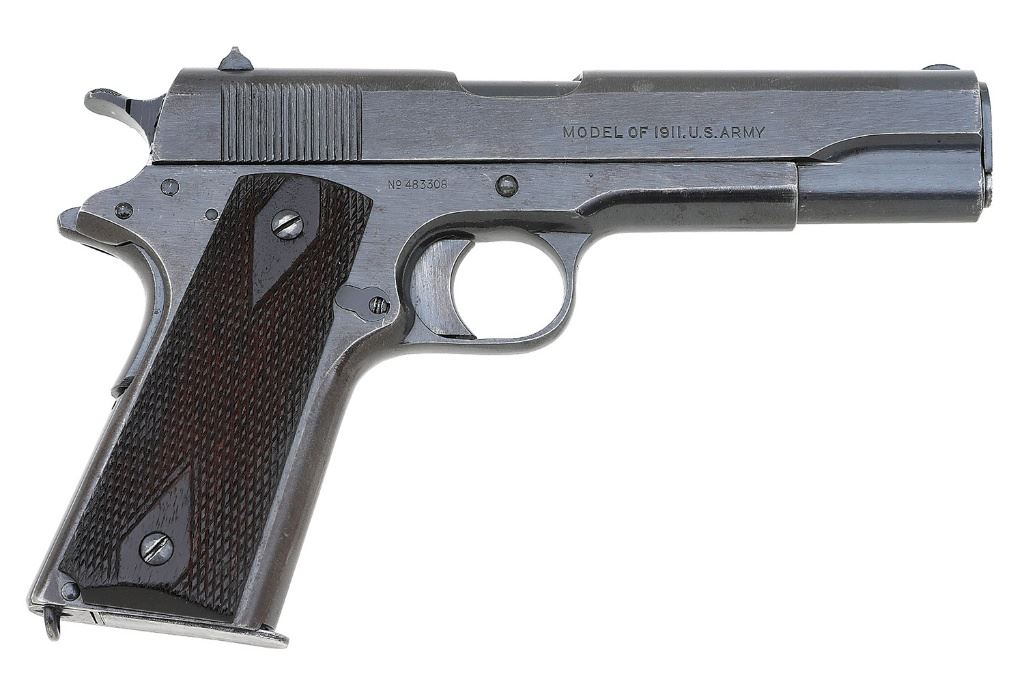 serial #483308, 45 ACP, 5'' later Colt marked barrel showing light frosting in the first half of the bore and strong rifling throughout. This late war gun remains in fine condition. The metal surfaces retain about 90% arsenal grade restored blue showing high edge wear, the straps have toned to brown, and a few handling marks. The finish is strong under ambient light but tones to a soft brown hue under strong direct light. The double diamond factory walnut grips rate about very good showing light wear and handling marks. The left panel is a Remington Rand replacement while the right is an original Colt. Most of the controls and small parts appear correct for the period of manufacture although the recoil spring plug is an earlier variety with square detent. The ''eagle / S/6'' inspection stamp and other markings remain crisp overall. It includes a Scovill Manufacturing seven-round magazine with welded floorplate. A nice gun for the upstart collector that can stand the occasional range trip. (8A11728-919) {C&R} (1200/1800)
