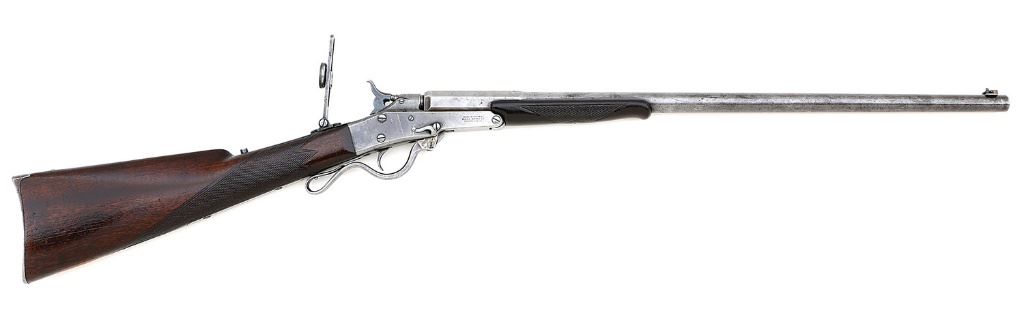 serial #14225, 22 LR, 24'' round barrel with octagonal breech section and a mostly bright very good plus bore showing some mild oxidation and pinprick pits in the grooves and otherwise strong rifling throughout. This is a nice honest example of a desirable rimfire model Maynard and an early example of a 22 LR rifle, showing proper ''16'' barrel twist stamp on the underside, indicating the LR cartridge. The rifle is also equipped with a factory tang sight and May 17, 1887 patent aperture disc with six selectable peeps. Coincidentally, 1887 was the year the 22 LR cartridge was introduced. The metal surfaces have mostly toned to a pleasant medium pewter gunmetal patina showing some mild gray-brown undertones and remnants of light oxidation staining along the barrel. The action retains some generous hints of smoky case-hardening with a few wisps of colors here and there while the hammer retains fine fire blue. All markings remain intact and strong, the left side of the action with ''1873'' stamp and the right side not bearing the ''1882'' stamp. The checkered walnut buttstock and forend with slight schnabel remain in very fine condition showing some darkening from the years and scattered light dings and handling marks, otherwise maintaining a nice honest appearance overall. There is an old piece of maple that has been used to fill in an apparent sling swivel inlet along the toe line. The rifle is equipped with standard carbine-style buttplate and sighted with the aforementioned tang sight and a Beach combination front that retains strong gold wash; there is no rear dovetail. The barrel is matching the frame and locks up well and the action seems to function well mechanically. A nice honest example of these desirable rifles and an early piece of 22 LR history. (13B11743-2) {ANTIQUE} (2000/2500)