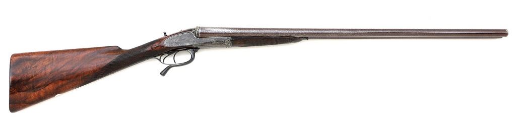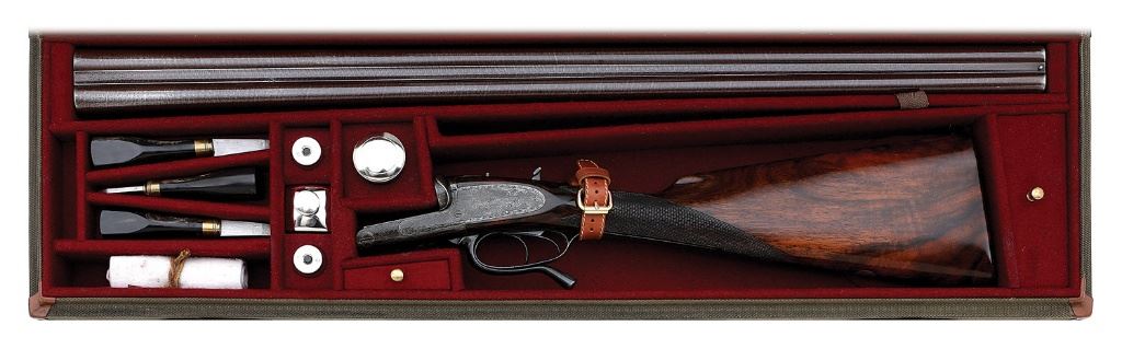 serial #6849, 12 ga (2 3/4”), 30” damascus barrels choked cylinder and improved cylinder with a bright near excellent left bore and a mostly bright very good plus right bore that shows a few areas of moderate oxidation about mid-bore. The chambers of this double appear to have been lengthened from their original 2 1/2” and the undersides of the barrels show two sets of nitro reproofs (both Birmingham and London for 2 1/2” shells) along with the original London proofs still visible. The barrels retain about 80-85% of a no doubt older restored plum-brown finish showing some nice swirling damascus patterns throughout. The action has mostly toned to a deep gray patina and showing an old coating of protective lacquer, the triggerguard and lever a deeper blue-gray. The action is embellished in full coverage with nice English filigree scrollwork and maker’s name in riband on the lockplates, the embellishments softened slightly in a few areas but mostly strong. The barrel rib shows faded but mostly legible 86 George St. Edinburgh address and the water table shows Woodward patent 651 stamp. The compact nature of the lockplates also allowed for a round body style of action to be utilized. The checkered walnut buttstock and splinter forend with Anson release show nice figure and remain in very good plus condition as lightly cleaned and refinished showing nicely refreshed flat point checkering, some scattered light dings and the edges of the flats and drop points softened somewhat. Length-of-pull to the checkered butt is 14 1/8” with drops of 1 3/4” and 2 1/2”, the stock also with moderate cast-off. The shotgun is equipped with non-automatic switch-style safety on the upper tang, cocking indicator pins, double triggers, extractor and silver bead front sight. The barrels lock-up solid and mostly on-face showing just a few faint slivers of light in a few areas of breech and standing breech. The action seems to function well mechanically and weight is 6 lbs. 8 1/2 oz. The gun includes a nice quality more modern canvas-covered case with leather appointments and maroon felt lining that remains in very fine condition. The interior bears a facsimile Mortimer label and contains a full complement of attractive accessories. A nice antique double in an interesting configuration. (13C11604-4) {ANTIQUE} (2000/3000)