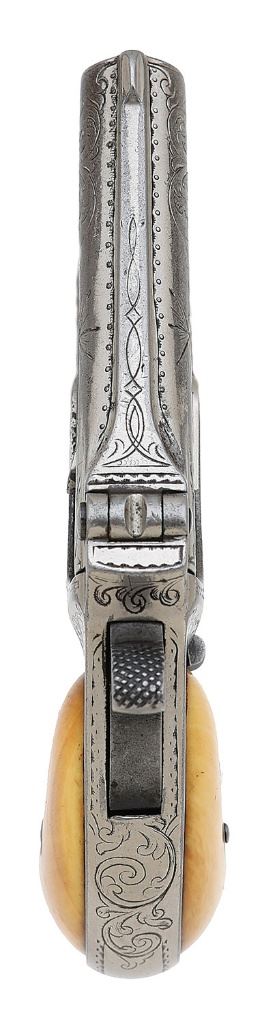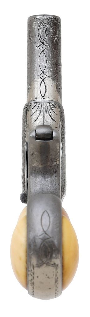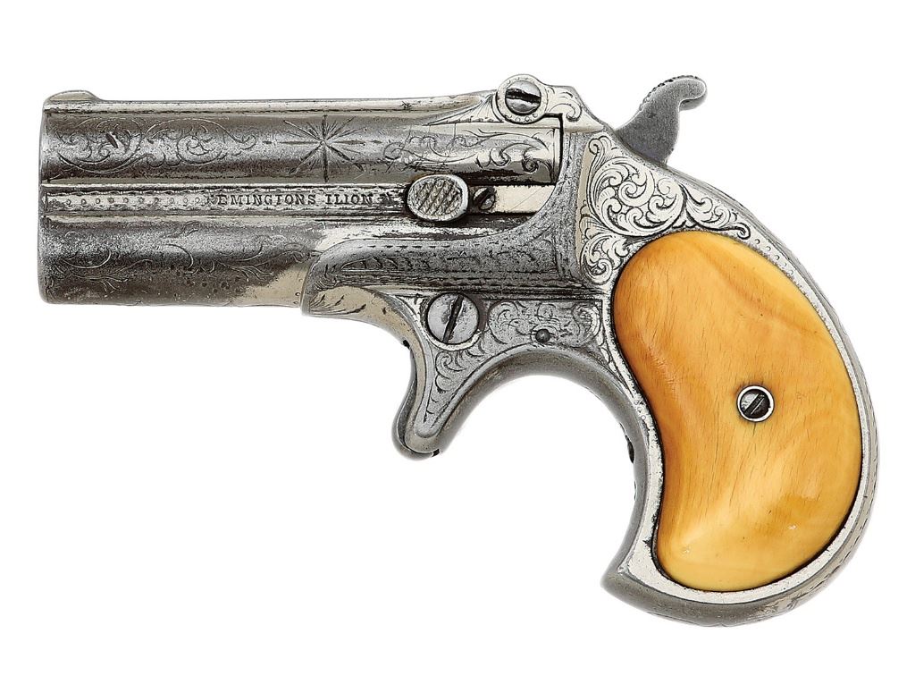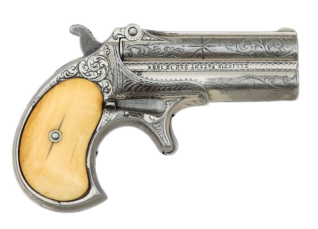 serial #1759, 41 RF, 3'' barrels with fair bores showing scattered old pitting and good rifling throughout. This is an extremely rare sub-variant of the Type I Transitional bearing ''REMINGTONS ILION NY'' address along the left rib and the Eliot's Patent marking along the right rib stamped upside down. Only fifteen of this variant are known and described on pages 103 and 104 of ''Dr. William H. Elliot's Remington Double Deringer'' by Drummond, et al. This exact example is also pictured on pages 73 and 103 as part of Drummond's collection. The metal surfaces are a relatively even mix of period nickel finish and flaked areas toning to medium pewter gunmetal blending in rather nicely with the surrounding nickel and showing a bit of old oxidation staining and edge wear. The gun is also period engraved in nice New York style, probably factory done, featuring flowing foliate scrollwork, nice border motifs and prominent starbursts on either side of the barrels. The embellishments show a few softened areas mostly along the left side. Finally, the deringer wears a nice set of smooth antique ivory grips in very fine condition showing a nice patina, a few age checks and attractive striations. The interiors of both panels are neatly numbered in antique ink ''1754'' along with a fancy cursive ''F'', the ''4'' perhaps being an honest error as the last digit on both the barrels and frame are undoubtedly a ''9''. The hinge appears to be intact, barrel-to-frame fit exhibits a hint of minor play and the action seems to function well mechanically. A nice example of a very elusive variant for the advanced Remington collector. (13D11199-126) {ANTIQUE} (4000/6000)