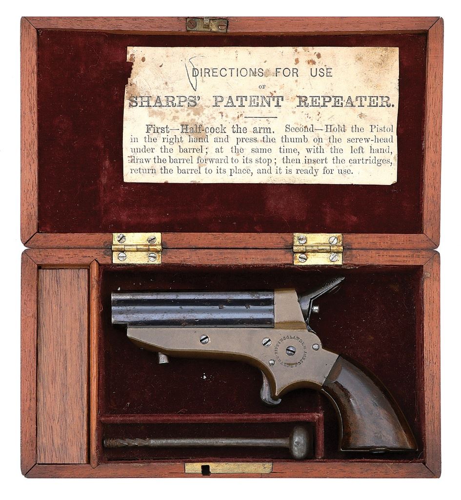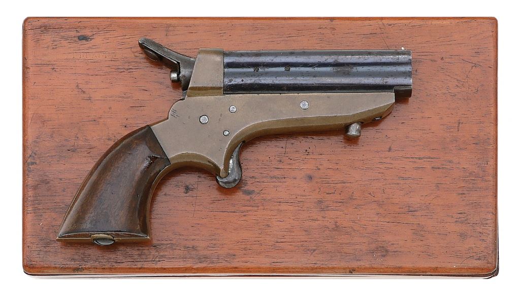 serial #4861, 22 RF, 2 5/8” four-barrel cluster with oxidized bores showing subtle remnants of rifling. The barrels of this plain grade pistol retain about 70% original bright blue showing some scattered flaking to mild gray-brown patina under bright light and some mild oxidation speckling. The frame is a nice ocher patina showing some scattered light dings and handling marks, the left side retaining strong maker and patent markings. The hammer retains strong vibrant case-hardened colors while its back spring shows good fire blue. The smooth walnut grips remain in near excellent condition showing a few tiny dings and light handling marks. The action will require some mechanical attention as the hammer does not drop at full cock when the trigger is pull, requiring manual assistance. The barrels lock up well and the hammer nose does rotate. The pistol comes in an original plain mahogany case that remains in very fine condition showing some light dings and a couple of the corners and joints starting to separate slightly. The interior is lined in maroon baize showing some honest wear and the inside of the lid has an instructional sticker affixed, showing mild wear. The wooden lid on the covered compartment appears to be an old replacement and the case contains a case-hardened jag. A nice plain grade ensemble. (13B11134-20) {ANTIQUE} (1200/1800)