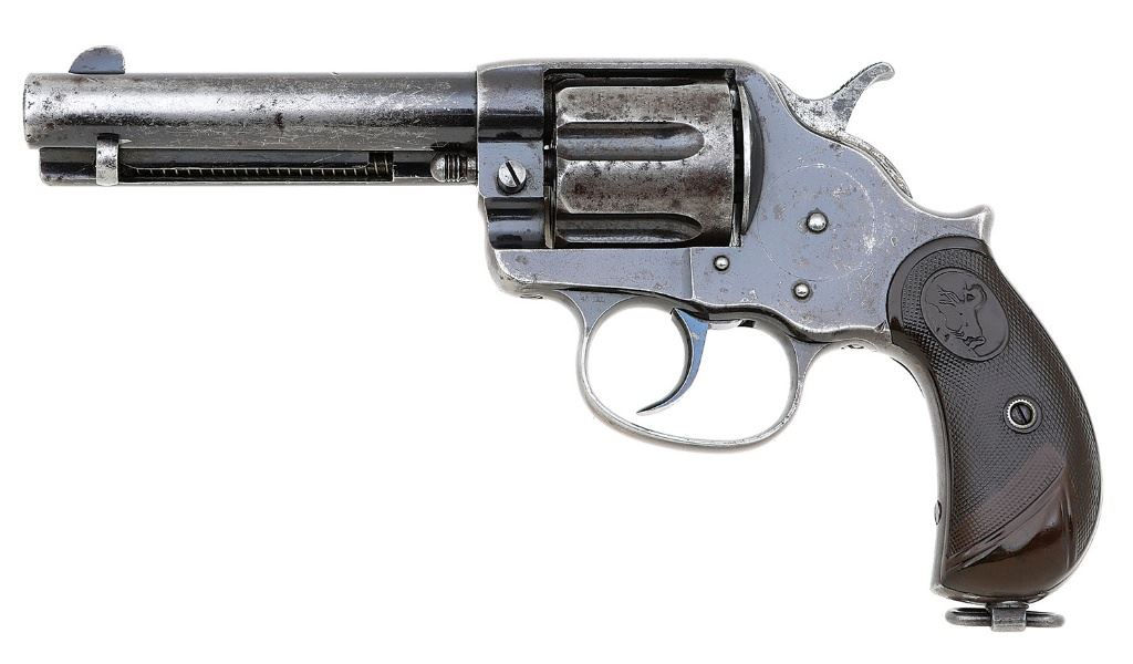 serial #20754, 45 Colt, 4 3/4'' barrel with a mostly bright very good bore showing some scattered light pitting and strong rifling throughout. The metal surfaces retain about 50-60% original bright blue flaking to a mix of medium gunmetal and mild gray-brown patina with scattered old dings and some small areas of pinprick pitting from honest use. The small parts retain some hints of fire blue and all markings remain intact and strong. The black checkered hard rubber grips with Rampant Colts remain in very good plus condition showing some mild overall smoothing and toning to brown. The cylinder is matching the frame and the action seems to function well mechanically in both single and double action. The included factory letter indicates the revolver shipped as-described on January 7, 1888 to Manzanares & Co. of Las Vegas, New Mexico Territory in a 25-gun shipment. This is an honest big frame double action with a desirable and romantic frontier shipping destination. (13B11523-107) {ANTIQUE} [Jim Thrash Collection] (2000/3000)