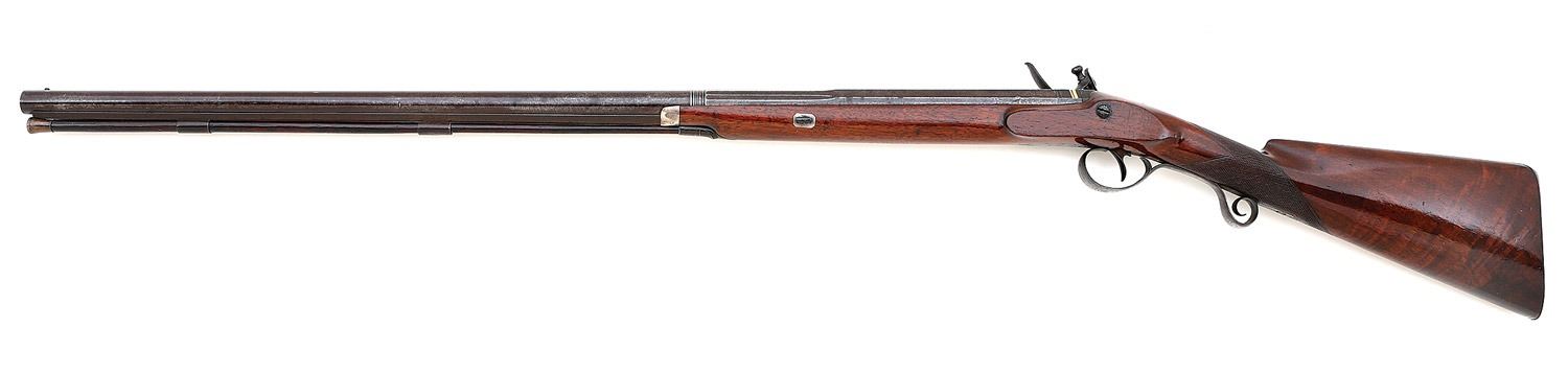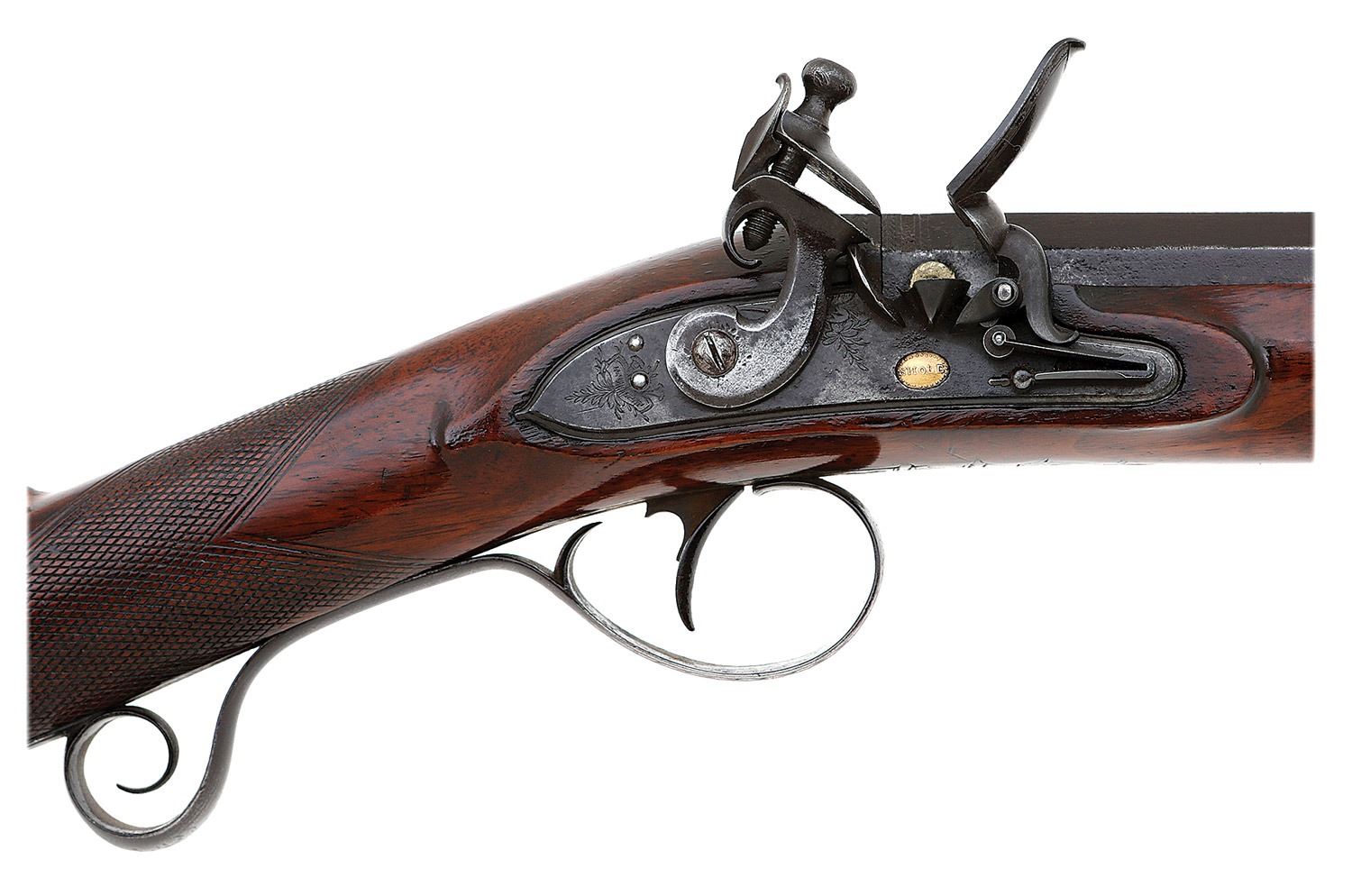 14 bore, 33'' part round part octagon damascus barrel with multi-faceted section and turned medials at point of transition and a partially bright good bore showing some areas of light pitting and oxidation. The barrel of this handsome original flint fowler retains perhaps 90% of an antique plum-brown finish with silvering along the high edges, some scattered old dings and light pitting around the brass-lined touch hole from honest firing. The breech plug did have three gold inlaid bands but they are now only partially intact and the barrel shows ''DEPTFORD'' locality marking. The underside of the barrel bears period Brimingham proofs and shows the name ''WALDON''. The lockplate is nicely constructed with rounded edge and pronounced teat at the rear, the hardware very graceful as well with waterproof pan and bridled roller frizzen. The back edge of the pan shows a small chipped out area that is relatively minor and the lockplate features some nice foliate embellishments, maker's name ''SHOLE'' impressed in gold and the frizzen with a nice foliate border. The fancy iron triggerguard shows panoply of arms along the bow of the guard and nice pineapple finial while the nosecap, barrel wedge escutcheons and monogram plate atop the wrist are all of silver. The checkered walnut stock remains in very fine condition showing a little older added oil finish and a few carefully cleaned light dings along the sides of the butt, a few minor flakes along the edges near the lockplate and some other handling marks. The stock flat edges remain well-defined, the checkering is mostly strong and the hardware fit remains nice overall. The sides of the buttstock show some nice subtle grain figure as well and the original brass-tipped hickory ramrod with worm end is present. The barrel is sighted with silver bead front sight and the lock seems to function well mechanically. This is a very nice high quality fowler, sadly any information on the maker appears to be elusive. (13C11579-46) {ANTIQUE} (1500/2000)