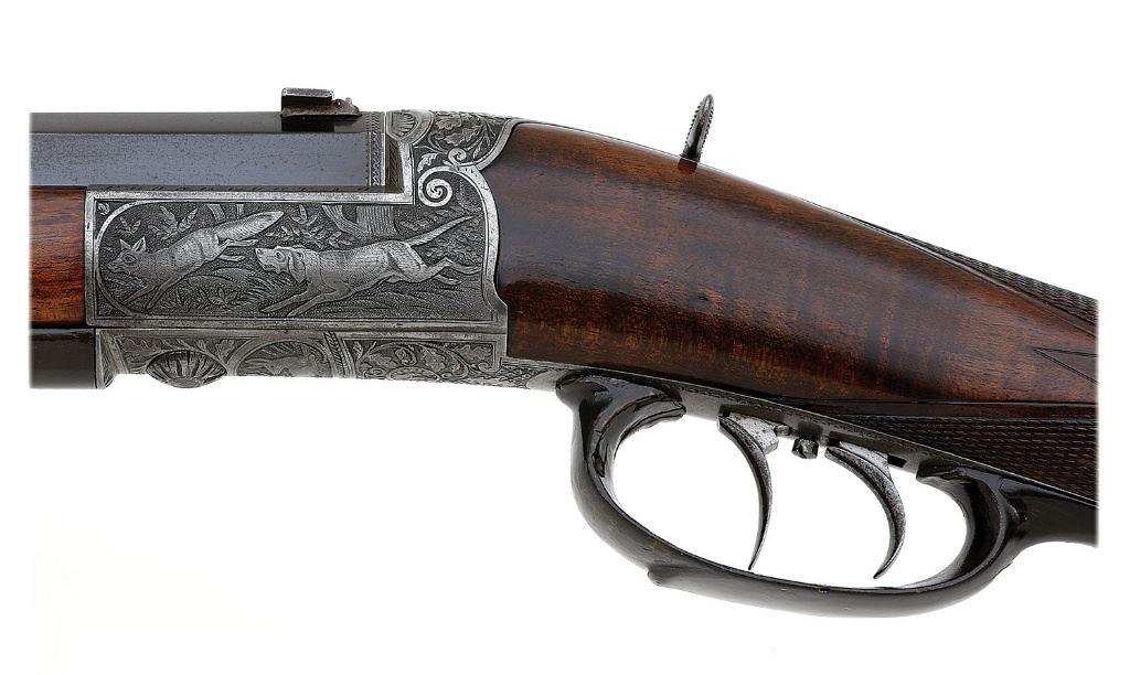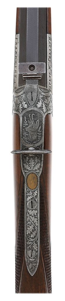 serial #10217, 9.25 CF, 27 3/4'' octagon barrel with a very good bore showing some scattered light oxidation and pinprick pitting with otherwise strong rifling. This is a nice Collath rifle in an attractive stalking rifle configuration, the inside frame marked ''9.25'' and it appears to be chambered in Collath's 9.3x65R cartridge though a proper chamber cast should be performed to confirm this. The barrel retains about 75-80% original blue appearing stronger under ambient light with overall toning to a pleasant deep gray-brown patina and scattered freckling. The front sling swivel hardware has been re-soldered on at some point and the top flat is nicely matted. The action has toned to a nice smoky case-hardened patina with the edges of the action showing the expected maker markings. The action is embellished in full coverage with some really wonderful Germanic oak leaf motifs, matted background shading and lovely extensive game scenes consisting of a game dog chasing a fox on the left, pair of roe deer on the right, portrait of chamois on top and a resting doe on bottom. There is an un-engraved brass monogram plate on the upper tang as well and the horn underlever and fancy triggerguard remain in about very good condition showing a coating of old varnish and the guard with a number of competent repairs. The checkered walnut buttstock and smooth forend remain in very good plus condition as lightly cleaned and refinished showing some scattered light dings. The left-side cheekpiece retains nice edges and the wood exhibits some attractive grain figure throughout. The smooth rosewood buttplate shows a small filler repair at the toe and length-of-pull is 13 3/4''. The rifle is equipped with a full complement of iron sights including a flip-up rear aperture, standing u-notch rear with two flip-up leaves and medium German silver bead front. The rifle is equipped with wing-style safety at upper tang and double set triggers. A very nice rifle in a fine configuration and with some lovely embellishments. (13C11108-136) {C&R} [Tom Devers Collection] (1800/2200)