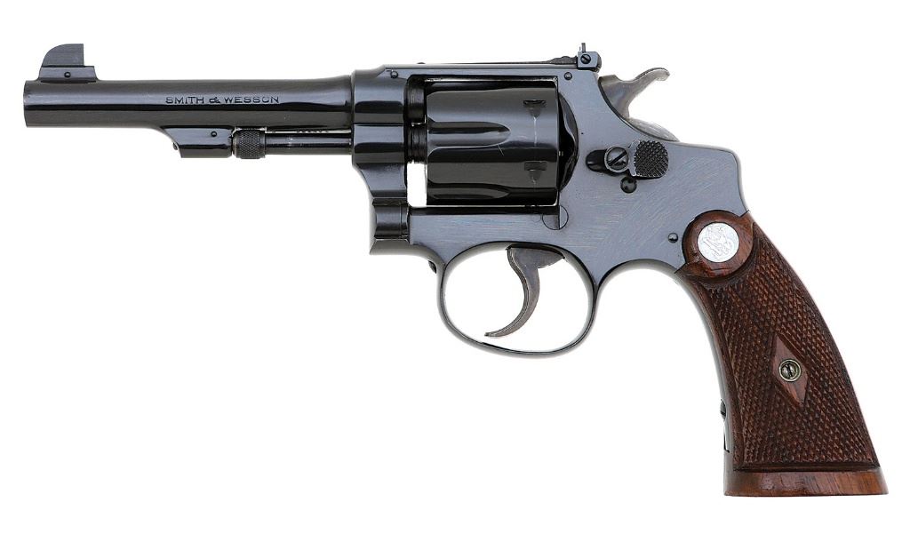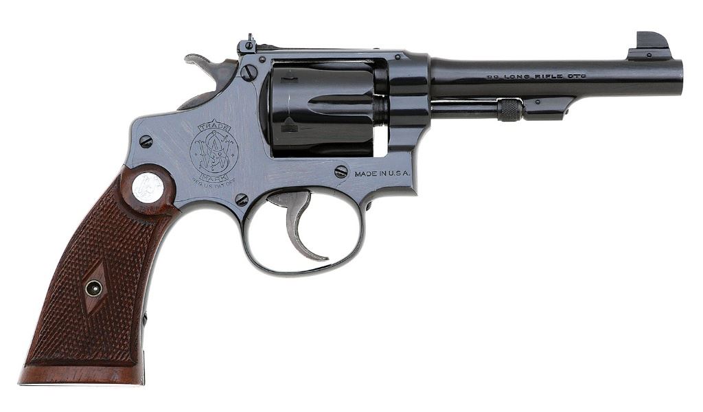 serial #533471, 22 LR, 4'' barrel with an excellent bore. This beautiful Kit Gun remains in superb condition showing minimal use. The metal surfaces retain about 99% original blue with minor edge wear and a few insignificant handling marks. The service trigger and hammer retain robust case-hardened colors with light operational wear. This lovely Kit Gun is equipped with un-numbered diamond checkered walnut factory stepped grips featuring silver S&W medallions, they remain in excellent condition with a few light handling marks. This gun features a Patridge front sight, black blade adjustable rear sight, and all appropriate parts are correctly numbered to the gun. A fine investment for the pre-war Smith & Wesson collector. (8B10826-632) {C&R} [Dr. W. Lloyd Hudson, Jr. Collection] (2500/4000)