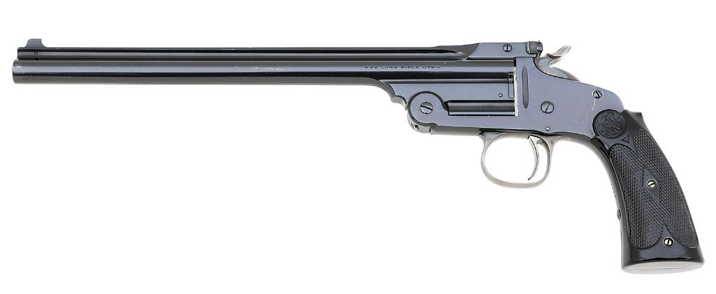 serial #4607, 22 LR, 10'' barrel with a bright excellent bore. This beautiful pistol remains in fantastic condition. It retains about 98% to perhaps 99% original bright blue showing light edge wear, a few insignificant handling marks, and slight thinning in areas. The hammer and triggerguard retain robust case-hardened colors while the trigger is bright. The un-numbered diamond checkered factory hard rubber extension grips feature S&W monograms and rate excellent. This lovely gun features a blade front sight, adjustable rear sight, and the barrel, latch, and extractor are correctly numbered to the gun. Barrel to frame fit is tight and the action remains crisp. A beautiful example of the Second Model. (8B10826-641) {C&R} [Dr. W. Lloyd Hudson, Jr. Collection] (2000/2500)