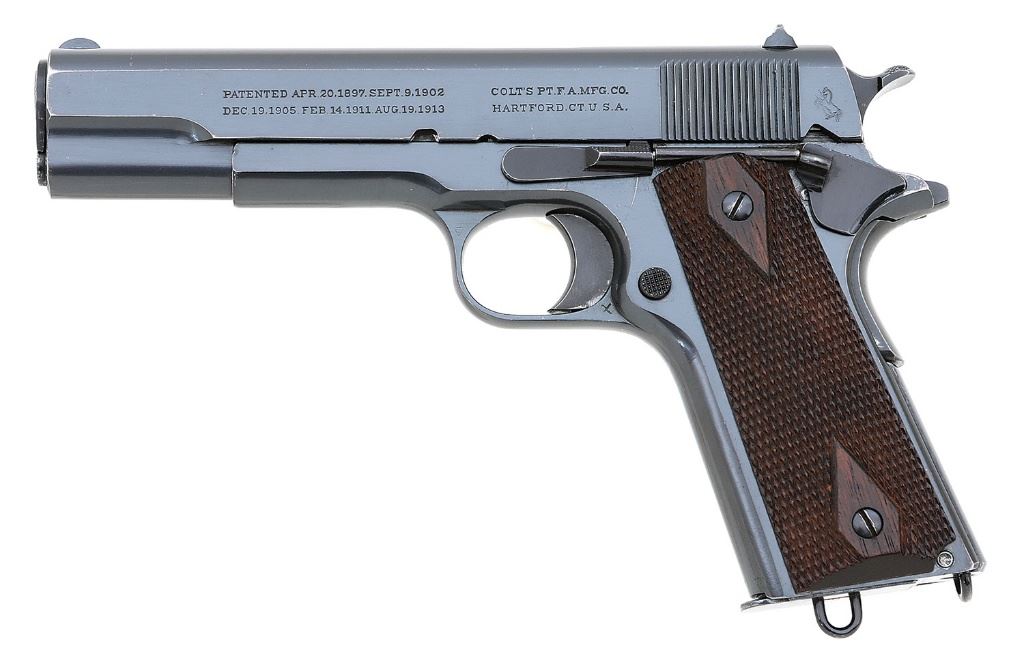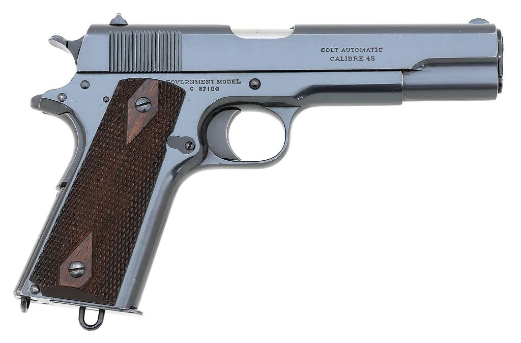 serial #C87100, 45 ACP, 5'' barrel with an excellent bore. This lovely early war gun (1917) remains in superb condition. The metal surfaces retain about 96% to perhaps 97% original blue showing light edge wear, the grip safety has toned to brown, there are light handling marks, and a few assembly marks. The double diamond checkered walnut factory grips rate excellent showing a few lightly compressed diamond points. This pistol has correct parts for the period of production and the markings remain crisp. The barrel has the proof mark in front of the lugs with the inspector mark struck off center next to it, possibly an ''O''. The frame is marked ''GOVERNMENT MODEL'' while the slide has the correct patent dates. This lovely gun includes a single Colt two-tone magazine with lanyard loop on the pinned floorplate. This is a beautiful early war gun in wonderful condition. (8B11777-1) {C&R} (3000/5000)
