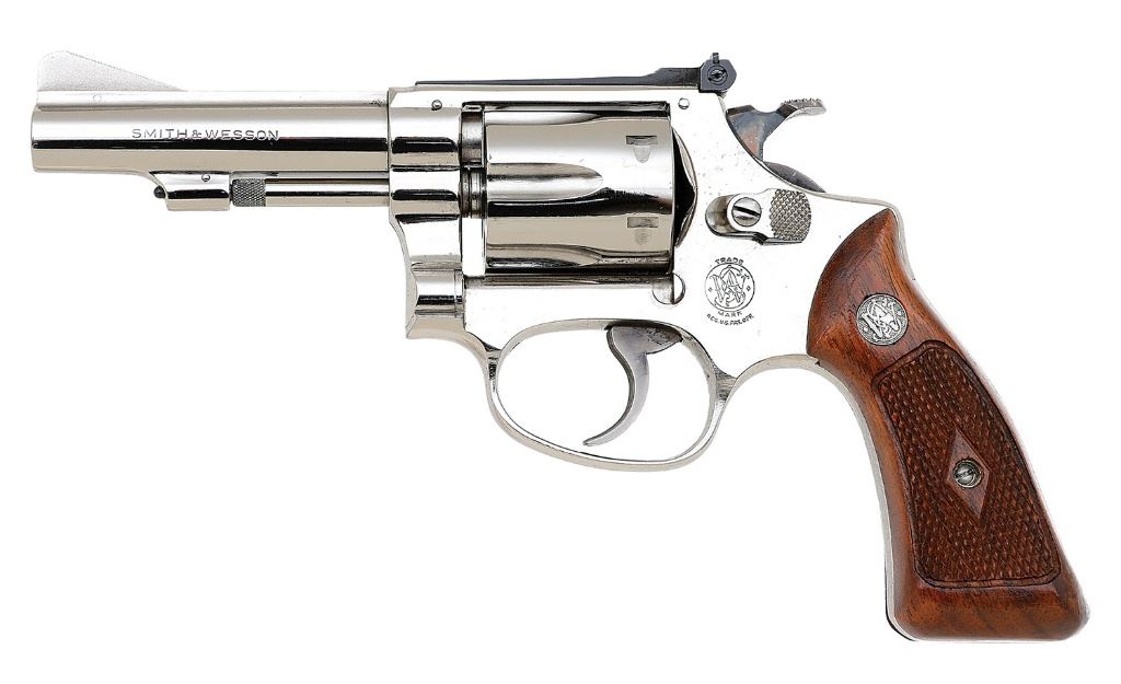 serial #M4749, 22 Winchester Magnum RF, 3 1/2'' pinned barrel with a bright excellent bore. The Magnum 22/32 Kit Gun remains a coveted collectible. This one has a desirable finish and is as-new-in-box. The metal surfaces retain about 99% plus original nickel plate. The service trigger and semi-target hammer retain beautiful case-hardened colors with minor operational wear. The diamond checkered factory walnut square butt Magna grips feature silver S&W medallions, they are numbered to another gun, and remain in excellent condition. This gun is sighted with a nickel plate Baughman ramp front sight and a black blade micro adjustable rear sight. It includes the original silver factory box that is correctly end labeled and numbered to the gun, unopened cleaning kit, manual, and paperwork. The box rates about very good showing light corner wear although one of the reinforcing metal corners is missing on the base of the box. A truly superb Kit Gun. (8B10826-412) {C&R} [Dr. W. Lloyd Hudson, Jr. Collection] (2000/3000)