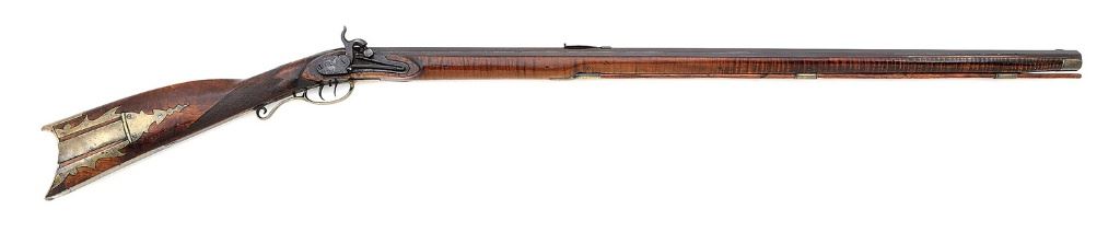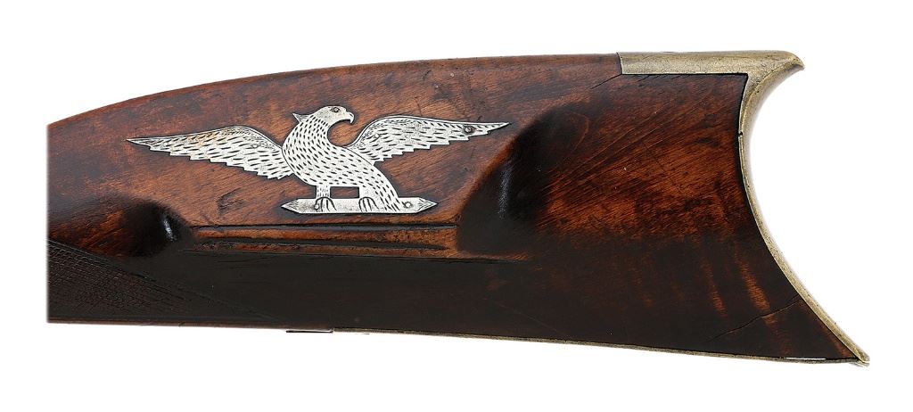 .44 cal, 39 3/8'' octagon barrel with a partially bright good bore showing light pitting and oxidation in the grooves and otherwise strong rifling throughout. The barrel and lock have mostly toned to a deep rich plum-brown patina showing a few old dings and scattered oxidation, the breech with some moderate erosion from cap splash around the nipple bolster. The barrel appears to be unmarked and the rifle is equipped with an interesting exposed-style lock with small cover plate that shows light foliate embellishments and the initials ''DL'' neatly engraved in script. The upper tang also shows some light foliate embellishments and the rifle features brass hardware including: nosecap, ramrod thimbles, tailpipe, triggerguard with curlicue at rear, crescent buttplate, long toe plate, rather spartan partially pierced patchbox and decorative lock screw escutcheon all bearing a pleasant patina and some scattered light handling marks. The maple stock remains in about very fine condition showing some scattered light dings, an old repaired sliver along the right edge back from the nose and small crack at the toe. There is honest wear around the nipple bolster from cap splash and the stock shows nice tiger striping, graceful sloped back comb line and squared-off left-side cheekpiece inlaid with a very attractive and folksy German silver American Eagle. A simple hickory ramrod is present and the rifle is sighted with a v-notch rear sporting sight and brass blade front. Equipped with double set triggers, the half cock notch is slightly worn and the lock seems to function normally at full cock. An interesting and attractive rifle. (13B11804-24) {ANTIQUE} [Dale Beeks Collection] (1800/2200)