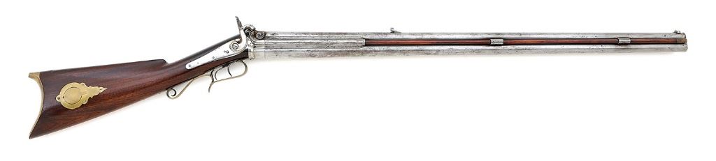 .36 cal over 12 bore, 33 1/2'' barrels with a mostly bright very good plus rifled bore showing a few spots of light oxidation or perhaps a light pit and a very good smooth bore showing remnants of some pinprick pitting. The barrels are a dull pewter patina with areas of light oxidation here and there, with the odd minor handling ding or two as well. The arm is sighted with a simple blade front and semi buckhorn-style rear sight and is maker marked on the top flat behind the rear sight ''J Holt Howell Mich'', being of quality construction with nice flaring bolsters, the upper barrel with a small threaded cleanout hole. The bolsters sweep forward nicely into long well-formed tailpipes for the ramrods. The back action locks and hammers are a bright silvery case-hardened patina showing some hardened oil, the hammer spurs nearly vertical and very nicely checkered. The stock rates about excellent as very lightly cleaned with some older nicely added oil finish but is largely unmolested showing nice straight grain. The single spur triggerguard, buttplate and simple patchbox are all brass with a mellow patina. The lock mechanisms seem to function well mechanically with crisp in-time hammers and the original ramrods are included. Holt was active in Howell Michigan between 1857 and 1862. A solid over under combination gun. (13A11804-10) {ANTIQUE} [Dale Beeks Collection] (1500/2000)