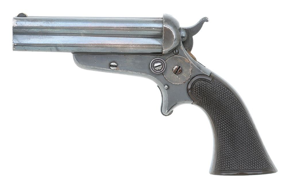 serial #1657, 32 RF, 3 1/2'' four-barrel cluster with mostly bright very good bores showing some scattered small areas of light oxidation and pitting with otherwise strong rifling throughout. The metal surfaces retain about 97-98% original silver finish showing a little minor flaking at the muzzles and along the right side barrels, and a few scattered minor dings. The silver has taken on a lovely dark tarnish overall, all markings remain crisp and the barrel release button retains a healthy amount of brilliant fire blue. The black checkered gutta-percha grips remain in excellent condition, the barrels lock-up nicely, the case extractor is intact and the action seems to function well mechanically. A lovely early Model 3 with the sideplate. (13A11777-20) {ANTIQUE} (1000/1500)