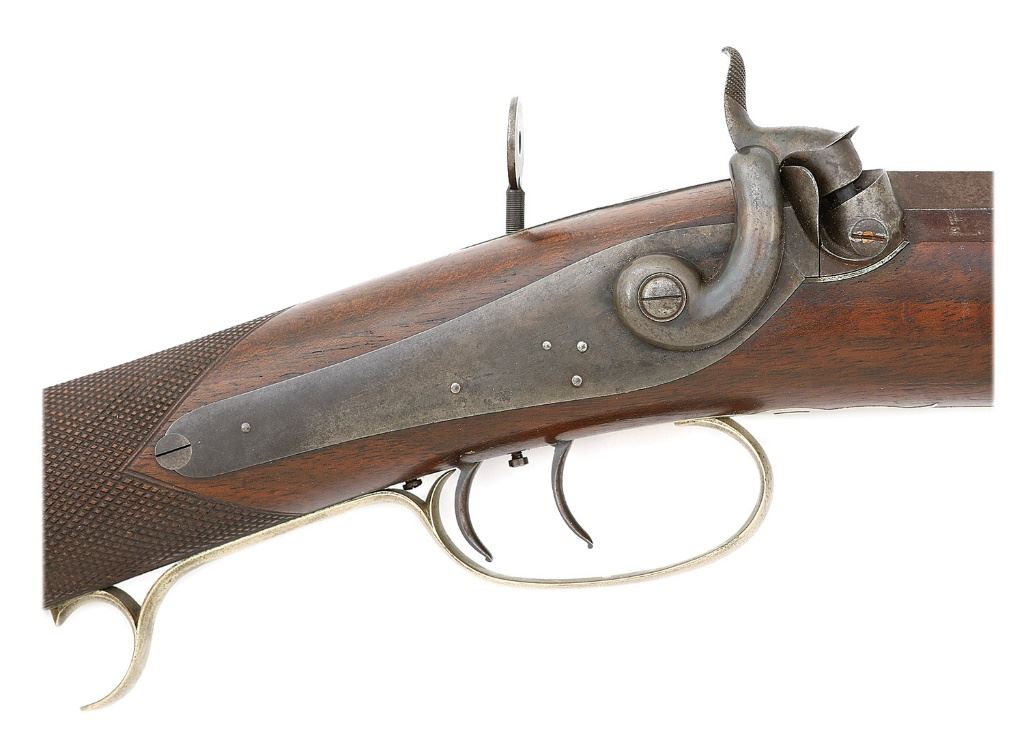 .36 cal, 30" octagon barrel with a bright near excellent bore showing a few spots of mild oxidation nearer the muzzle and strong rifling throughout. The barrel of this rifle retains about 90-92% original plum-brown finish showing some silvering along the high edges and scattered fine oxidation staining. There are four holes for attaching a false muzzle (no longer present) and there is a small diamond shaped inlay of gold just ahead of the front sight, the sight retaining much of its original bright blue. The underside of the barrel is stamped "L. WHEELOCK" and sadly the two ramrod thimbles have broken off at some point. The rifle is equipped with an unmarked back action lock with rather slim-necked hammer; the lock, patent breech and breech tang all show lovely case-hardened colors muting slightly along the lockplate. The double set triggers retain a healthy amount of nice fire blue and the rifle is equipped with rather simple German silver hardware including tailpipe, single spur triggerguard, buttplate with long toe plate, and wedge escutcheons, the right escutcheon showing some light dings. The checkered walnut stock with horn tip remains in very fine condition retaining much of its original oil finish and showing just some scattered light dings, handling marks and a 3/4" chip at the right edge of the horn tip. The fine checkering with neatly mullered borders remains completely intact and mostly crisp and the metal-to-wood fit and edges are excellent. The rifle is sighted with a small lollipop rear sight and target globe front with fine post. The lock will require a little tinkering as the hammer does not cock reliably. A rather Spartan but nicely constructed rifle. (11739-104) {ANTIQUE} [Ex-David & Lore Squier Collection] (1500/2000)