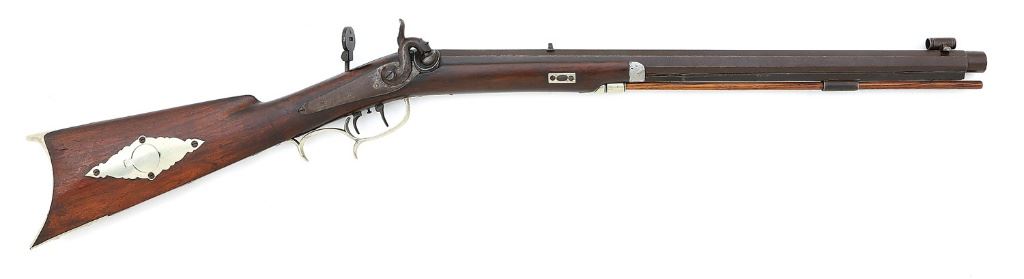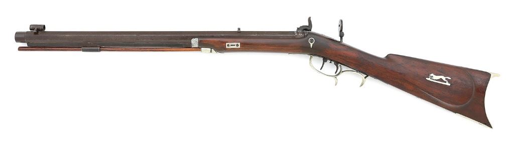 .42 cal, 20 3/4'' octagon barrel turned for starter (not present) with an oxidized bore showing softened rifling. The barrel of this rifle has mostly toned to a deep plum-brown patina showing some scattered old light dings and oxidation staining. There are some old dings and tool marks along the under-rib, it perhaps having been neatly reattached during the period of use, and the maker markings and address along the top flat have softened somewhat remaining mostly legible. The back action lockplate is similar to the barrel retaining some streaks of silvery case-hardened patina and the hammer is a bit loose. The rifle is equipped with iron ramrod thimble and pewter nosecap, with the balance of the hardware composed of German silver, including the tailpipe, rectangular wedge escutcheons, dual spur triggerguard, attractive spartan patchbox, crescent buttplate with toeplate, lock screw escutcheon and decorative fox inlay in the cheekpiece. The smooth walnut stock with characteristic Lewis left-side cheekpiece remains in very good condition, the butt end retaining a healthy amount of original varnish showing some scattered light dings, a few minor drying cracks and a small hole along the toe line. The area around the lock screw and much of the forend shows an old added brown finish masking some repaired cracks and chips. Equipped with double set triggers, the lock seems to function well mechanically and the rifle is sighted with its original lollipop tang sight, simple v-notch rear and target globe front with fine bead. A simple replacement hickory ramrod is also included. A rather attractive ladies or perhaps buggy rifle from this prolific New York maker. (13B11739-94) {ANTIQUE} (1000/1500)