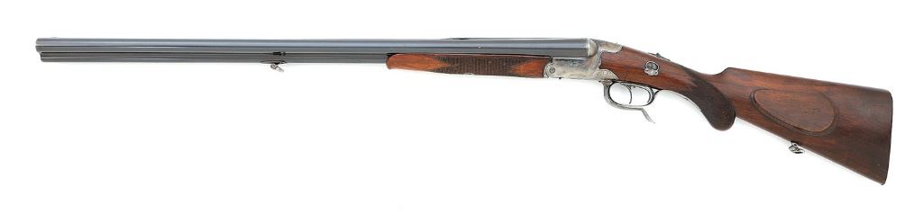 serial #2482, 16 ga (2 1/2”) / 9.3x72mmR, 27 1/2” Kruppstahl barrels choked a tight full and improved modified with bright about very fine bores showing a few small areas of mild oxidation speckling and the right barrel with a shallow lightly raised dent about 9” ahead of the chamber. The rifle bore is excellent with crisp rifling. The barrels retain about 94% original blue showing some scattered light handling marks and small areas thinning to mild gray-brown patina under bright light. The action retains perhaps 50% vibrant case-hardened colors in the more protected areas with the balance muting and toning to a pleasant silvery and smoky gray case-hardened patina. The action features some simple line borders with a matted section at the top and the edges of the barrel breeches with a nice geometric border and scallop-engraved dolls head extension. The checkered pistolgrip walnut buttstock and forend with subtle schnabel remain in very fine condition showing an old oil finish with some scattered light dings and handling marks, there is a tiny drying crack and a few small flakes at the upper tang. The stock features left-side European cheekpiece and smooth steel buttplate and the arm is equipped with sling swivels. Length-of-pull is 14” with drops of about 1 5/8” and 2 3/4”. Features Greener safety, upper tang barrel selector, German silver cocking indicator pins, extractor, manual flip-up u-notch rear sight (somewhat loose) and German silver bead front sight. Lock-up is by dual underbites with dolls head extension and is tight on-face. The front trigger for the rifle currently does not set properly though the action otherwise seems to function normally. A quality Suhl drilling. (13B11739-40) {C&R} (2000/2500)