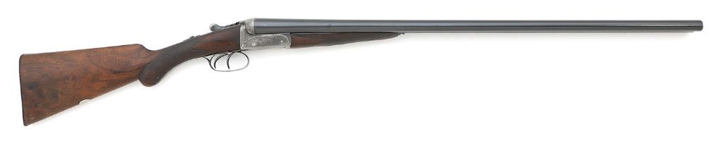 serial #62205, 12 ga (2 1/2”), 30” barrels choked about improved cylinder and full with mostly bright very good bores showing a few areas of light pitting, a few spots perhaps more moderate in the right barrel for a few inches about mid-bore. The barrels retain perhaps 80-85% original rust blue appearing stronger under ambient light that shows some overall mild fading and thinning to gray-brown patina along with some other scattered handling marks. Barrels are not marked as to any maker and show Birmingham nitro-proofs for 2 1/2” shells 1 1/8 oz. load. The action has mostly toned to a silvery gray case-hardened patina with some areas of gray-brown and a bit of oxidation speckling here and there, retaining some streaks of vibrant case-hardened colors in the protected areas. The action is embellished in near full coverage with fine quality English filigree scrollwork and nicely detailed game scenes with two dogs on the right and four pheasant on the left. The upper tang shows “SAFE” inlaid in silver and there are some remnants of original bright blue lurking about the protected areas of the small action parts. The checkered pistolgrip walnut buttstock and splinter forend with push-button release remain in very good condition showing honest wear overall with the checkering rather worn, scattered light dings and the buttstock with a few thin grain cracks from drying, mostly along the left side butt though they are mostly unobtrusive and very minor. There is a tiny chip at the toe and the sides of the butt show some nice figure. Stock features an un-engraved silver monogram plate along the toe line and checkered horn buttplate that rates about very good plus. Stock shows a little cast-off, and length-of-pull is 14” with drops of 1 3/4” and 2 1/2”. The arm is sighted with single German silver bead and the barrels lock up tight on-face with top lever resting a little right of center. Shotgun features automatic safety and lock-up is by dual under-bites and hidden third fastener and the action seems to function well mechanically with robust ejectors. Minimum wall thicknesses measured are about 0.029”-0.030” and weight is 6 lb. 14 1/2 oz. The arm includes an original leatherbound hard case with Thomas Johnson & Son interior label that remains in very good condition showing some overall light staining and scuffing, part of the left strap with buckle had detached but the piece is included. The case contains some vintage cleaning accessories, a key and three-piece rosewood cleaning rod, and was apparently intended for a two-barrel set. A very respectable Birmingham trade gun. (11739-50) {C&R} (1500/2000)