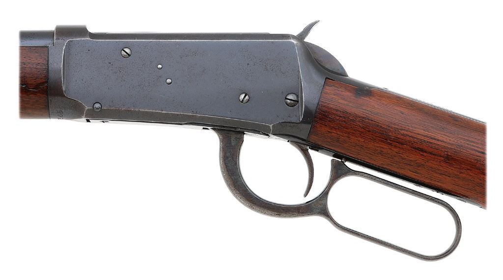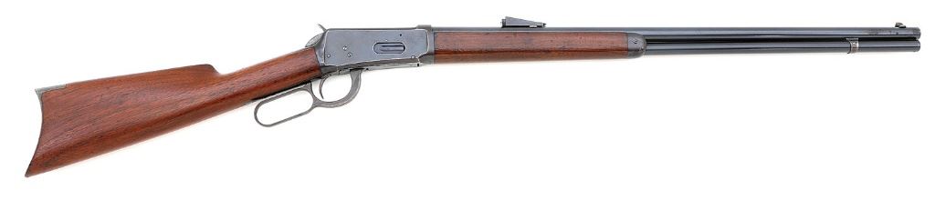 serial #277565, 32 W.S., 26'' nickel steel round barrel with a full magazine and a bright very good plus bore with fine pinprick pitting scattered throughout with strong rifling. The barrel and magazine of this 1905-vintage rifle retain about 95% original blue, appearing stronger under ambient light, with light muzzle wear, a few spots of cleaning pinprick to perhaps light pitting, and fine freckling scattered through but easily missed except under bright light. The magazine hanger and forend cap have toned a gray patina with remnants of original blue, the forend cap showing general oxidation staining. The receiver retains about 75-80% original blue with light high edge wear and fine flaking to brown, the loss greatest towards the front, and the lever and hammer exhibit wonderful vibrant case-hardened colors with light oxidation staining and the loop toning to a gray case-hardened patina. The smooth straight grip walnut stock and forend are in very good plus to near excellent condition as lightly cleaned with an older added oil finish, showing a few light handling marks and remnants of old dings, an about 2 3/4'' hairline crack just below the right woodline of the forend that is easily missed upon first examination, and the stock is a bit shy of the metal in spots; the curved steel buttplate shows mellow case color with some light oxidation staining speckled throughout. The two-line barrel address, model marking on the tang, and other factory markings are intact and clear, and the tang screw shows the beginnings of slot wear. The rifle is sighted with a small German silver blade front sight and Winchester's 32 Special rear sight. A fine choice for the Winchester enthusiast. (14B11762-11) {C&R} (2000/3000)