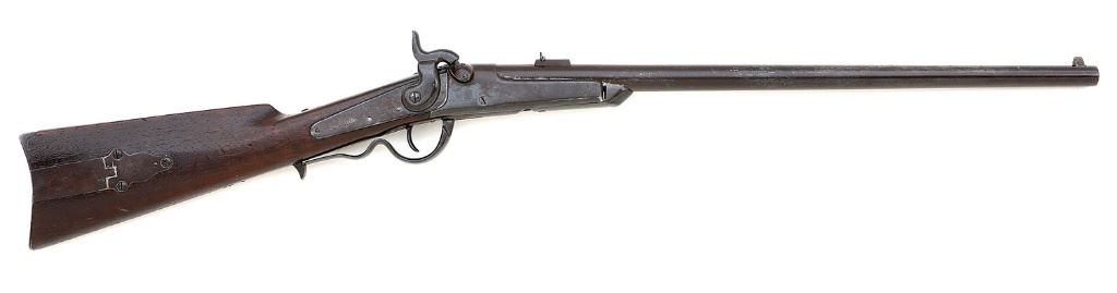 serial #13644, .50 Cal., 22” barrel with a mostly bright bore showing some shallow pitting near the breech with excellent rifling. The iron surfaces have toned to a brown patina with some casehardening remaining on the internal components with light pitting around the nipple. The metal markings remain crisp and legible, the saddle ring and sling bar are intact and the action functions well mechanically. The walnut buttstock rates very good with original finish showing typical small impact marks and abrasions with some minor chipping around the rear sling bar mount. The iron buttplate and patch box are nicely fitted with no overlap, the patch box containing a spare nipple. The toe line of the stock displays in faded block letters “Gallagher’s - Civil War”, likely from spending time in a display setting, the left side of the butt showing a barely legible lightly scratched inscription appearing to be a 19th century date with a soldier’s initials. A nice example of this Civil War carbine, one of approximately 18,000 purchased by the Union that proved unpopular with the troops. Cartridge extraction required the use of a knife tip or other pry tool, problematic when fighting on horseback. (25A11700-9) {ANTIQUE} (1000/1500)