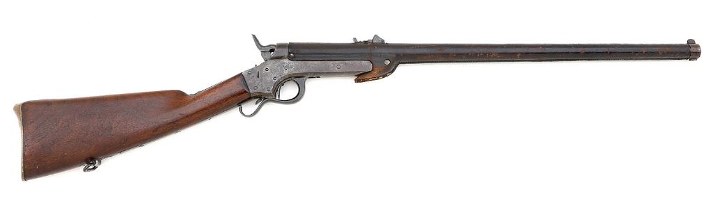 serial #10590, .52 RF, 24'' barrel with a dark oxidized bore with strong rifling. The receiver has toned to a mottled gray patina with scattered pinprick pitting showing some bright blue color case hardening remaining in the protected areas. The lever has toned to brown, the brass buttplate displaying an attractive dull golden patina, the top tang and several receiver screws showing moderate slot damage. The metal markings remain fairly crisp and legible with the visible internal components displaying matching serial numbers, this example retaining the often missing sliding safety. The leather barrel cover shows typical scuffs and flaking with no shrinkage at the muzzle band, tight seam stitching along the barrel, a bit of loss around the left side retaining screw with a hand stitched repair on the base. The walnut stock rates very good as lightly cleaned with a tight 1'' crack behind the upper tang. The rifle functions well mechanically and would make a respectable example for any Civil War enthusiast. (25A11700-8) {ANTIQUE} (1500/2000)