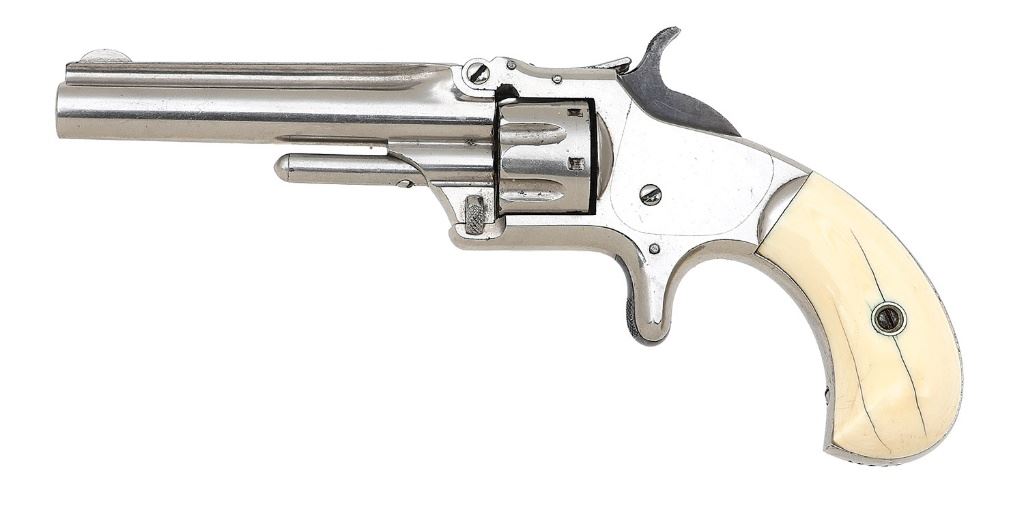 serial #87467, 22 RF, 3 3/16'' barrel with a bright very good bore showing a ring of pitting at the midpoint with otherwise strong rifling. This lovely Third Issue retains 98% original nickel finish, showing only scattered light handling wear with faint flecks of loss around the hinge and barrel and some flaking about the cylinder with a minor abrasion on the backstrap. The hammer and trigger have toned to an even gunmetal and the smooth ivory grips rate very good plus, with the left panel showing two lengthy darkened checks with one intersecting the escutcheon, the right panel remaining smooth and toning nicely to caramel with a minute check near the escutcheon, with the toes and backstraps showing what appear to be very skillful synthetic repairs, showing almost perfect symmetry between them. The gun times and locks up appropriately with no discernible play when at rest. A fine example. (26B10826-586) {ANTIQUE} [Dr. W. Lloyd Hudson Jr. Collection] (1000/1500)
