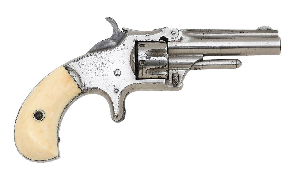 serial #117332, 22 RF, 2 11/16'' barrel with a bright near-excellent bore showing a ring of mild pitting at the midpoint with strong rifling throughout. This Third Issue retains 93% original nickel finish, showing scattered light handling marks and intermittent high edge wear with flecks of bubbling and fine pinprick pitting scattered about the frame and cylinder. The hammer and trigger have toned to an even gunmetal with the hammer showing scattered light oxidation staining and the smooth ivory grip panels remain in very fine condition, showing only a few flecks of darkening and handling wear with a nice patina and showing excellent fit. Timing and lockup appear sound with the gun exhibiting only very light play when at rest and barrel markings remain crisp and excellent. A handsome Third Issue. (26B10826-295) {ANTIQUE} [Dr. W. Lloyd Hudson Jr. Collection] (1000/1500)