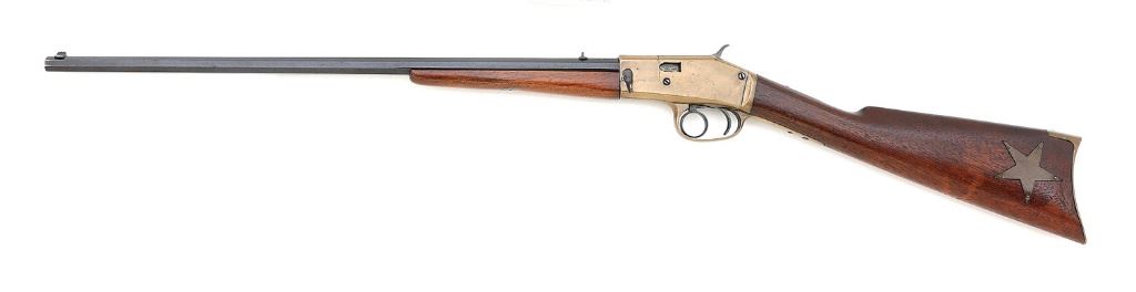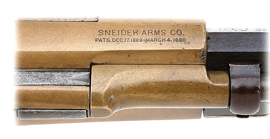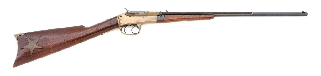 22 RF, 22'' octagon barrel with a partially bright very good bore showing a little pinprick pitting and old oxidation with otherwise strong rifling throughout. The barrel of this interesting rifle retains about 65-70% original blue appearing stronger under ambient light with some scattered old oxidation and toning to a pleasant plum-brown patina under bright light. The magazine tube located on the right side of the barrel has mostly toned to plum-brown and the left flat shows ''22 CAL'' stamp. The action has mostly toned to a pleasant ocher patina showing some scattered light dings and handling marks, the small action parts mostly toned to gray perhaps with a hint of smoky case-hardening in the very protected areas. The top of the action retains fine markings stamped ''SNEIDER ARMS CO. / PATS.DEC.17.1889-MARCH 4.1890.'' which can be traced back to patents issued to Charles Edward Sneider of Baltimore. The right side of the action also shows a very lightly scratched number ''A38632''. The smooth walnut buttstock and forend remain in very good plus condition as lightly cleaned long ago showing some scattered light dings and handling marks, the buttstock with a neatly repaired chip at the toe. The crescent buttplate is a light ocher patina and the sides of the buttstock have a rather endearing large brass star tacked-on. The arm is equipped with simple sporting sights and the action seems to function well mechanically. The forward ring trigger of this interesting rifle cycles the bolt and cocks the hammer while the cartridge ''lifter'' slides the cartridge over from right to left to be presented for the bolt to pick up. A small catch on the right-side rear of the forend is pressed to lift up the magazine tube for loading and the barrel is stamped-numbered ''7'' beneath the magazine tube. The rifle is also equipped with a takedown lever on the left side. This is a very nice example of an extremely rare and interesting repeating 22 rifle, research having uncovered only one other example sold on the secondary market some seventeen years ago. (13C10826-705) {ANTIQUE} [Dr. W. Lloyd Hudson, Jr. Collection] (2000/3000)