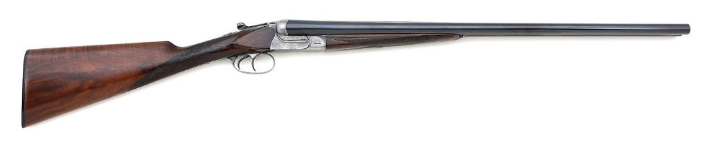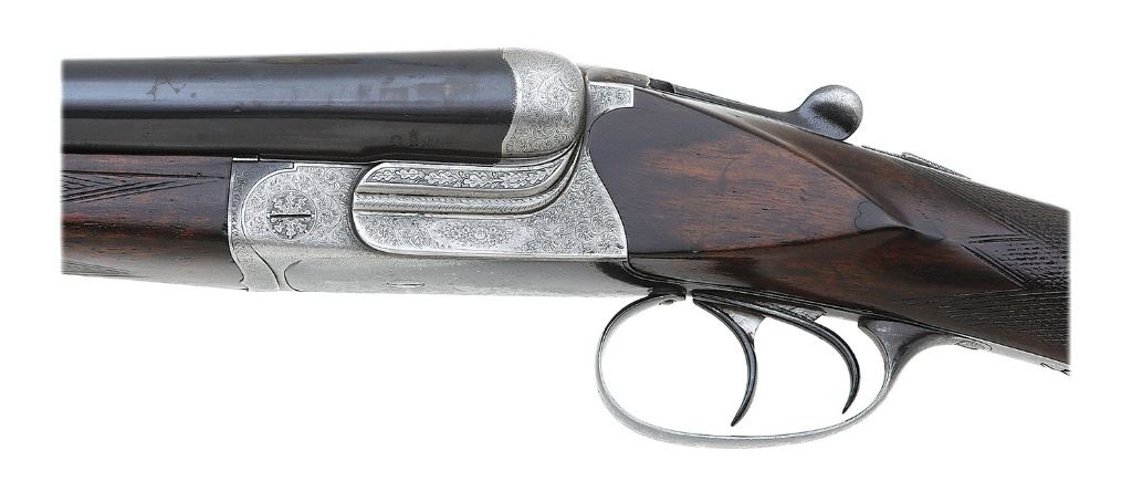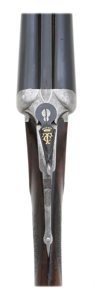 serial #1432, 12 ga (2 1/2''), 28'' chopper lump barrels choked improved cylinder in both with bright very fine bores showing some sparsely scattered spots of pinprick pitting. The barrels of this fine quality German double retain about 92% of an older good quality re-blacking showing some scattered thin scratches along the undersides and some areas of slight discoloration under bright light. There is a pair of small filler screws on the underside rib where sling swivel hardware was removed and the top rib retains good maker markings ''H. LEUE HOFLIEFERANT WAFFENFABRIK BERLIN'' along with an engraved ''1'' at the rear. The undersides show a very small Thad Scott import mark. The action has mostly toned to a pleasant silvery gray case-hardened patina and features nicely raised and sculpted flats with embellishments in full coverage consisting primarily of tight filigree scrollwork along with a few smaller rose and oak leaf motifs. The bottom metal and triggerguard show fading rust blue with bottom metal marked ''LEUE'S PATENT / No. 174828'' which covers the combination rear under-bite and top bite barrel locking system. The top lever shows a gold inlaid coronet over ''TC'' monogram. The checkered walnut buttstock and splinter forend with Anson-style button release remain in about very good plus condition as lightly cleaned showing scattered light dings, handling marks and rather worn checkering. There is a small filled hole along the toe line where a sling swivel once was and the stock has rather nice little heart-shaped arrow inlays of horn behind the flats and exhibits some subtle attractive grain figure. Length-of-pull to the grooved horn buttplate is 14 3/8'' with drops of 1 1/2'' and 2'', the stock with slight cast-off. Weight is 6 lbs. 14 oz., the action features sideclips and the barrels lock-up solid on-face though the action will require mechanical attention as the triggers are stuck and do not fire the gun and, probably related to this, the safety is stuck in the off position. Heinrich Leue acted as W.W. Greener's associate in Germany and this appears to be a high quality gun worthy of getting running again. (13C11621-116) {C&R} (1200/1800)
