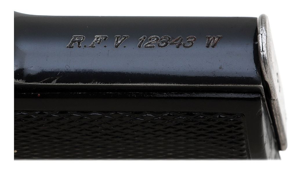 serial #985243, 32 ACP, 3 7/8'' barrel with a bright near excellent bore showing a little mild frosting and strong rifling throughout. The metal surfaces of this Reich Finance-marked pistol retain about 90% original bright blue showing some moderate high edge and holster wear along with a few pinprick pits scattered about. The 60-degree safety lever and extractor retain pale fire blue and all markings remain intact and strong with ''(Crown) / N'' commercial proofs and frontstrap marked ''R.F.V. 12343 W''. The original black checkered synthetic grips remain in very good condition showing some scattered light handling marks and a few more noticeable dings along the bases. The slide is properly scratch-numbered matching the frame and one blued flush base magazine is included. A nice example of a sought-after variant. (13B11728-950) {C&R} (1000/1500)