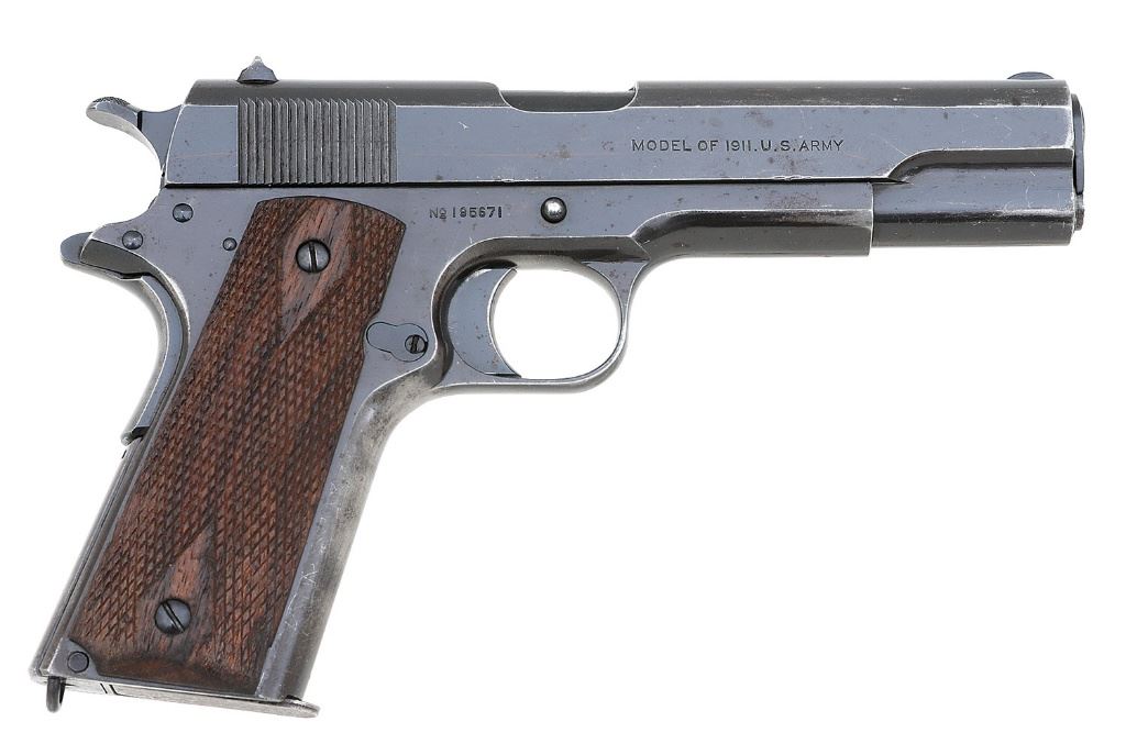 serial #195671, 45 ACP, 5'' Colt barrel with an about very good bore showing some darkness and moderate frosting in the grooves with otherwise strong rifling. The metal surfaces of this 1917-made pistol retain perhaps 70% of an older period reapplied polished bright blue with scattered light oxidation and areas toning to gray-brown patina. All markings otherwise remain intact and strong with good Rampant Colt at rear left of slide and ''GHS'' inspector stamp. The checkered walnut double diamond grips remain in about very good condition with mostly worn finish and some edge wear along the bottom. All parts appear correct for the period of manufacture and one blued welded base M.S. Little magazine is included. A solid First World War era pistol that may make for a fine shooter. (13A11728-881) {C&R} (1000/1500)