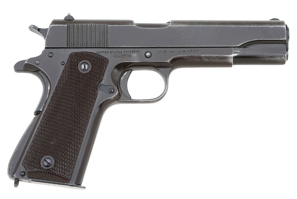 serial #842738, 45 ACP, 5'' High Standard barrel with a bright near excellent bore. This 1943-made pistol is equipped with a mismatched Remington Rand slide and retains perhaps 75% arsenal-reapplied Parkerized finish, much of the finish having taken on a deep brown tone with good gray-green along the protected edges, silvering along the high edges and a bit of light pitting along the sides of the barrel. All markings remain intact and strong with fine ordnance wheel on the rear right side of the frame and Colt factory VP proof, ''P'' and boxed ''WB'' inspector stamp on the left. The checkered brown plastic Coltwood grips remain in very good condition with scattered light dings and handling marks. One welded base Scoville magazine is included. (13A11728-937) {C&R} (1000/1500)