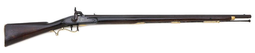 .75 cal., 39'' barrel with a bright bore having some very fine oxidation the last 3'' from the muzzle. The first percussion model of the six E.I.C. muskets as pattern A was flintlock and pattern B was a mixture of original flintlock and percussion parts. The barrel and lock of this musket have mostly toned to a brown patina with thin gray undertones, scattered fine oxidation and pitting and some patches of light to perhaps moderate oxidation atop the barrel along with a 7/8'' thin indentation behind the forend tip. The breech is marked ''D / 3'' and ''(crown) / V'' along with an undecipherable British proof. The center of the lockplate shows the familiar East India Company rampant lion holding a crown. The brass hardware remains mostly bright overall showing some scattered light staining and handling marks. The smooth hardwood stock remains in very good plus condition having been lightly cleaned and refinished with scattered dents, handling marks and a thin glue repaired crack behind the lockplate. An original ramrod is present along with the sights, the front swivel is no longer present, and the lock functions crisply. A very nice example of the rarer of the different East India Company muskets. (5A11666-29) {ANTIQUE} [Casey Collection] (1000/1500)