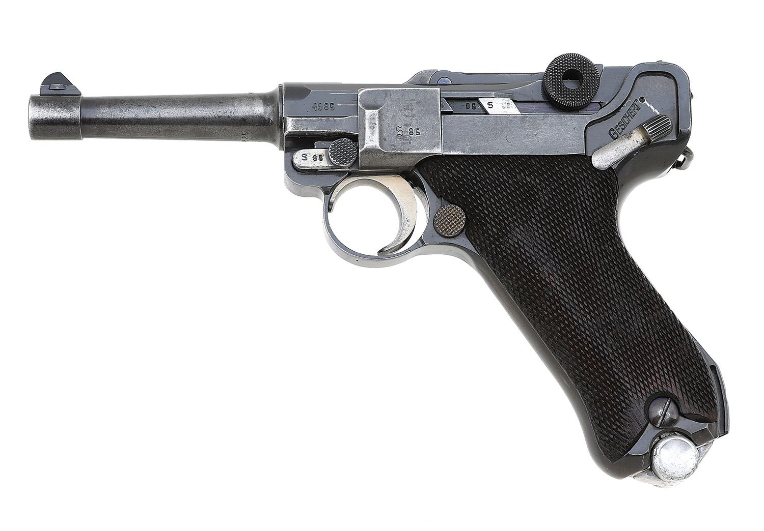 serial #4985, 9mm, 4'' barrel with a bright very good plus bore showing some fine frosting but strong rifling throughout. The metal surfaces of this K-date pistol retain perhaps 60% original blue, strongest on the receiver and in the protected areas, with the balance toned to a smoky gray-brown patina with a few light handling marks. The strawed parts retain very good color with edges toning to a silvery patina, greatest on the trigger face and safety, and the toggle pins and sear spring retain vibrant fire blue. The checkered walnut grips are in about very good condition with areas of light wear and flattened points of checkering, the screws showing remnants of fire blue at the edges otherwise toning to gray; both panels are numbered ''85''. The metal markings are intact and largely crisp, the ''B|90'' and ''S|91'' proofs on the receiver and droopwing firing proof on the barrel somewhat soft but still legible, small parts show the expected mix of script and gothic ''S'', and all the serialized parts are matching to the pistol, including the grooved firing pin; the rear toggle pin is unnumbered. The pistol retains the standard open sights and included is a bright-bodied aluminum-base magazine showing some light handling marks, the base marked ''6028 / a / +'' above a faint ''B|90''. An honest example of these desirable 1934-made Lugers. (14B11728-898) {C&R} (2000/3000)