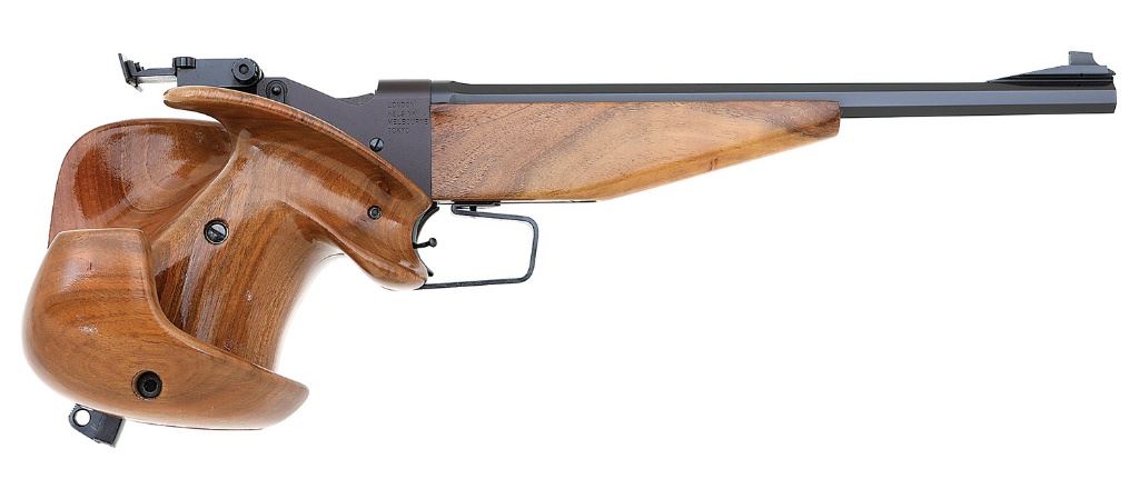 serial #31461, 22 LR, 11 1/4'' octagon barrel with an excellent bore. This lovely pistol has seen minimal use and remains in excellent condition. The metal surfaces retain about 99% original blue although the frame has toned to plum with a few insignificant handling marks. The smooth sculpted walnut Match grips feature thumb and finger rest, adjustable basket style palm rest and remain in excellent condition. The smooth walnut forend rates excellent. This gun features a Martini action, cocking lever, fully adjustable trigger, interchangeable Patridge front sight, and adjustable black blade rear sight with interchangeable slider (blades). The right side of the frame is marked ''London / Helsinki / Melbourne / Tokyo''. An excellent Free Style pistol for the discerning shooter. (8A11771-3) {C&R} (700/900)
