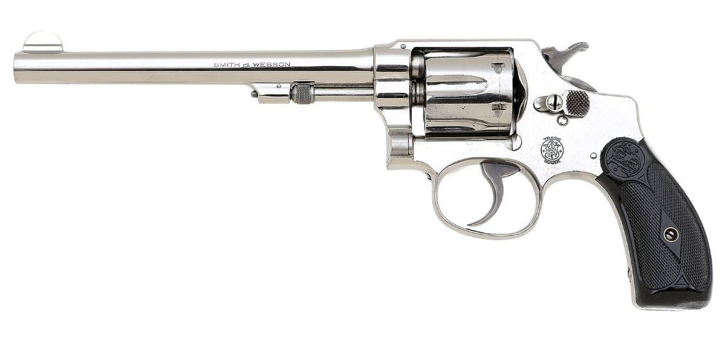 serial #30558, 32 S&W Long, 6'' barrel with an excellent bore. This splendid revolver retains about 99% original nickel plate showing scattered fine bubbling on the sideplate and minor handling marks. The service trigger and hammer retain robust case-hardened colors. The un-numbered replacement diamond checkered hard rubber factory round butt grips feature S&W monograms, the right panel rates excellent while the left shows a repaired chip at the butt. This gun features fixed sights, five-screw frame, and all appropriate parts are correctly numbered to the gun. A beautiful Third Model I-frame revolver. (8A10826-224) {C&R} [Dr. W. Lloyd Hudson, Jr. Collection] (1000/1500)