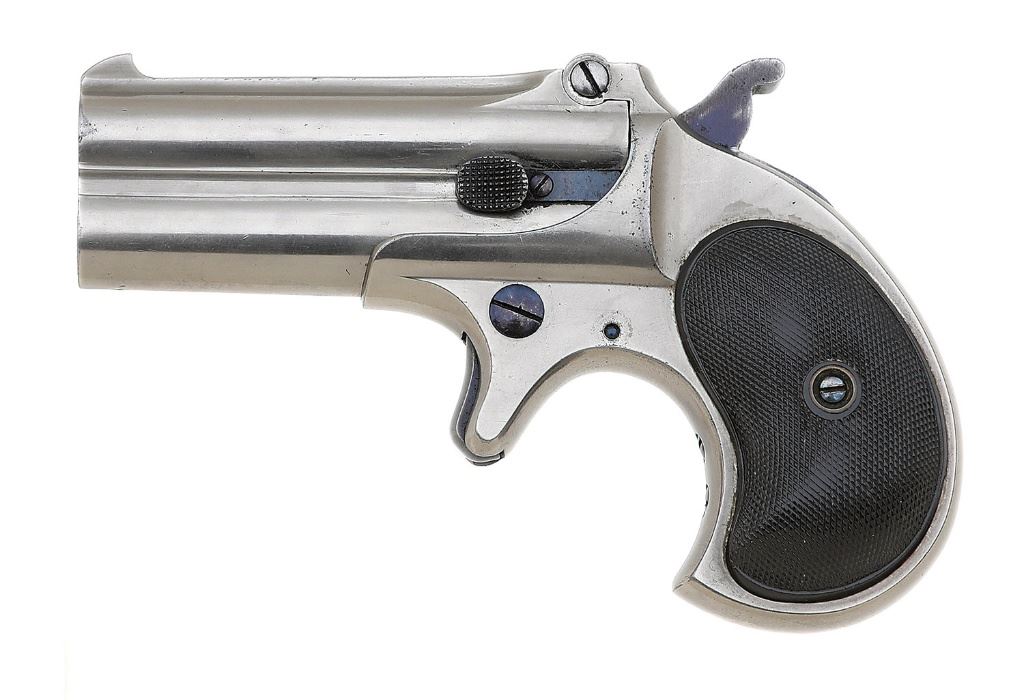 serial #19, 41 RF, 3'' barrels with bright excellent bores showing a few negligible flecks of frosting and pitting with strong rifling throughout. The metal surfaces of this Type II deringer retain 98% original nickel finish with light operational wear, some clouding throughout, a few scattered light handling marks, and perhaps the odd fleck of minute oxidation staining. The small parts retain generous original fire blue on some of the faces and in protected areas with the balance toning to a smoky gunmetal patina. The checkered hard rubber grips remain excellent showing only light handling wear and softening relative to their age. The gun locks up securely with mild play and appears to function well mechanically. A lovely low-number 95 Deringer in a fine state of condition. (26A10826-179) {C&R} [Dr. W. Lloyd Hudson Jr. Collection] (1200/1800)