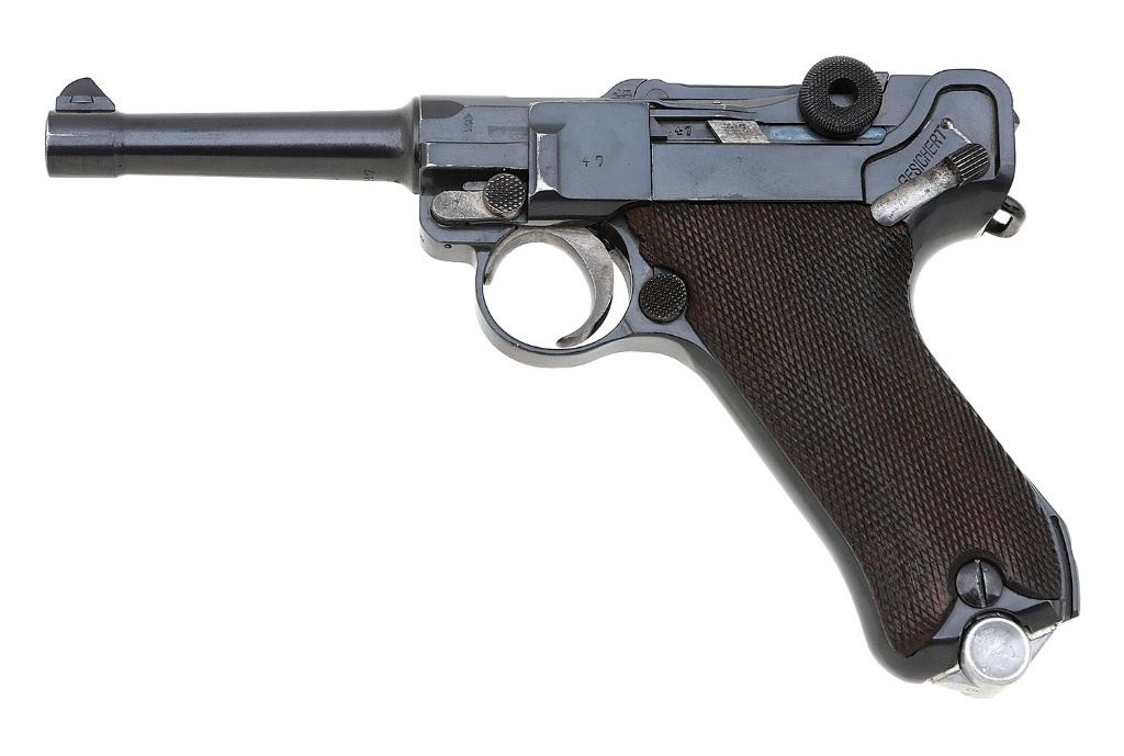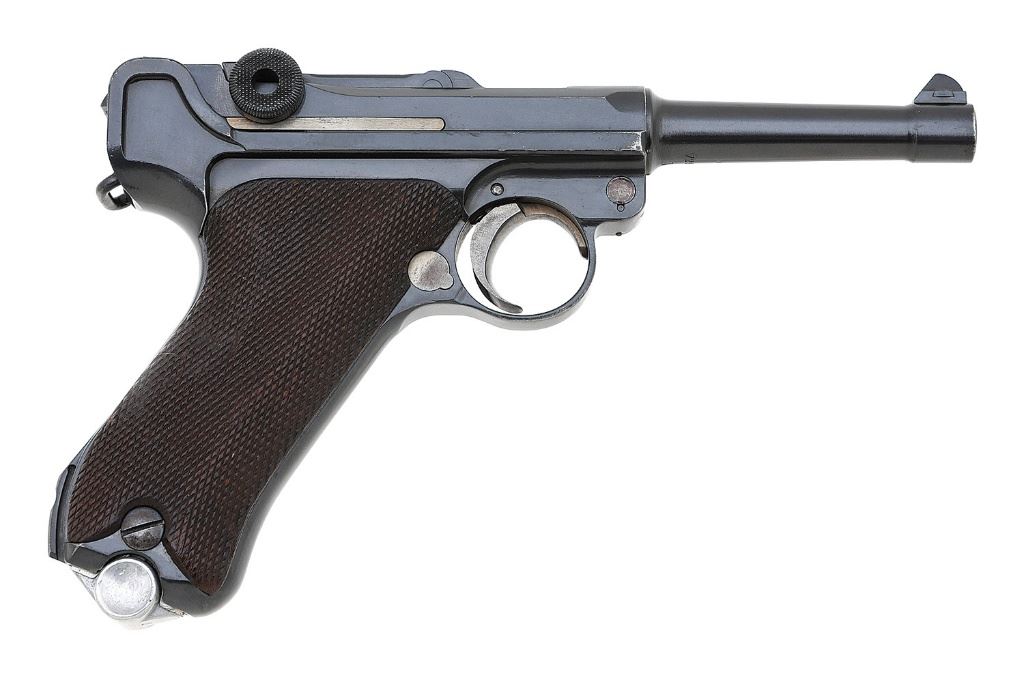 serial #7247a, 9mm, 4'' barrel with a very good bore showing scattered light oxidation but strong rifling throughout. The metal surfaces retain about 95% arsenal refurbished rust blue with light wear on high edges and contact points, some mild toning to gray on the front strap, and some scattered previous pinprick pitting and light dings beneath the finish. The strawed parts retain good color mellowing to a gray patina with light oxidation staining, save for the ejector which remains strong, and the toggle pins and sear spring show vibrant fire blue. The checkered walnut grips are in very good condition with a small chip beneath the safety and at the top of the left panel, light wear, and scattered dings and handling marks; neither panel appears numbered. The DWM monogram remains crisp, the chamber area is unmarked, strong commercial proofs are on the receiver and breech, the barrel shows a tiny eagle stamp above the serial number and gothic letter inspection stamp below the number denoting replacement by a police depot, and the numbered parts are matching to the pistol. The pistol retains the standard open sights, and included is a bright-bodied aluminum-base magazine showing some scattered light handling marks and tiny flakes of the finish, the base numbered ''2 / 3385'' with a police ''(eagle) L''. A nice police Luger for the collector. (14B11728-890) {C&R} (1200/1800)