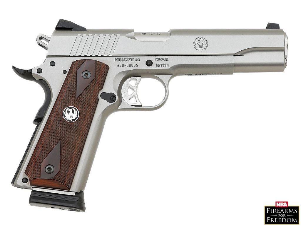 serial #670-00005, 45 ACP, 5'' barrel with an excellent bore. This lovely factory low number SR1911 appears unfired and as-new-in-box. The satin stainless steel surfaces remain in excellent condition. The double diamond checkered cocobolo grips feature silver Ruger Phoenix medallions and remain in excellent condition. This gun features Novak three dot sights, extended thumb safety, beavertail grip safety with memory pad, checkered flat mainspring housing, and three-hole long trigger with overtravel stop. It includes the original factory box that is correctly end labeled and numbered to the gun, shipping sleeve, a single factory seven-round magazine with flush floorplate, a single factory eight-round magazine with removable floorplate, Ruger marked soft case, bushing wrench, factory padlock with a pair of keys, fired case, manual, and paperwork. An excellent very early production SR1911. (8A11608-369) {MODERN} [N.R.A. Firearms For Freedom] (800/1200)
