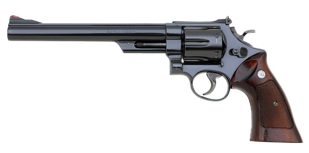serial #N322699, 44 Magnum, 8 3/8'' pinned heavy barrel with an excellent bore. This lovely mid-1970s revolver remains in excellent condition, retaining about 97% original blue with all the loss to very light oxidation staining on the serrated backstrap and a few minor handling marks. The .500'' target trigger and .500'' target hammer retain bold case-hardened colors with minor operational wear. The checkered goncalo alves factory grips feature silver S&W medallions, extractor cut, and remain in very good condition with a few minor chips and dings on the toe. This gun is sighted with a red ramp front sight and white outline adjustable rear sight. An excellent example of the famed ''44 Magnum''. (8A11523-88) {MODERN} (800/1200)