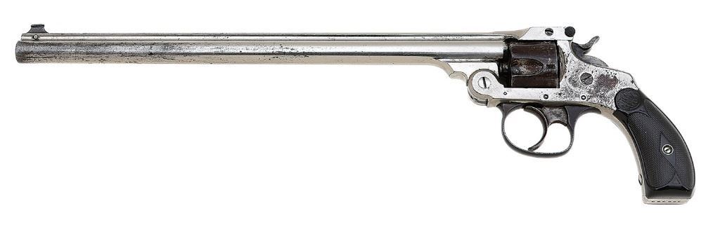 serial #156959, 32 S&W, scarce 10'' barrel with a bright excellent bore showing only light frosting with strong rifling throughout. The metal surfaces of this Fourth Model revolver retain perhaps 90% original nickel finish, showing scattered handling and high edge wear throughout with the balance of the cylinder toning to an oxidized brown patina, thinning lightly on the barrel with flecks of light bubbling throughout. The hammer and trigger have toned to a smoky gunmetal patina with the hammer showing remnants of case-hardened coloring and the triggerguard and rear sight latch toning to an even brown. The checkered hard rubber grips rate excellent overall, showing minimal handling wear with light softening and toning to a deep brown. The front sight blade appears to be a later-added replacement, timing and lockup appear sound, the ejector remains functional though returns slugglishly or not at all, and the barrel address marking remains largely crisp and legible with some mild softening through the top line. A slightly salty Fourth Model in a desirable configuration. (26A10826-688) {ANTIQUE} [Dr. W. Lloyd Hudson Jr. Collection] (800/1200)