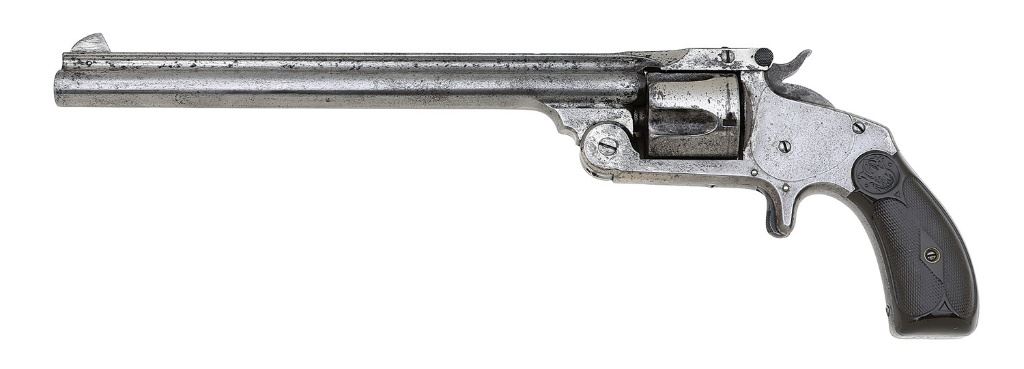 serial #100466, 38 S&W, rare 8'' barrel with and oxidized and pitted bore showing strong rifling throughout. This revolver retains perhaps 10% original nickel plate, the balance toned to a mild brown color under strong light with scattered stains from oxidation, dispersed pitting, and handling marks. The trigger and hammer have toned to gray with minor oxidation stains. The diamond checkered hard rubber factory grips feature S&W monogram, are numbered to the gun, and remain in excellent condition. The revolver features a pinned ramp front sight, fixed rear sight, tight barrel to frame fit, and all appropriate parts are correctly numbered to the gun. Timing and lockup will need mechanical attention. An unusual opportunity for the advanced Smith & Wesson collector. (8A10826-622) {ANTIQUE} [Dr. W. Lloyd Hudson, Jr. Collection] (800/1200)