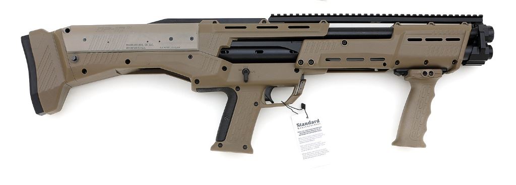 serial #DPP2141, 12 ga., 18 7/8'' Tru-Choke barrel with bright excellent bores. The metal surfaces of this as-new-in-box double barrel bullpup shotgun retain 99% plus original blue and black anodized finishes while the textured FDE polymer pistolgrip stock and forend with removable vertical foregrip rate as-new. The shotgun features 3'' chambers, Picatinny-style accessory rails at the 12 and 6 o'clock positions, ambidextrous safety levers and slide release and a 16 round capacity when using 2 3/4'' ammunition. Included is the original box, factory hangtags, manual, paperwork, cable lock with keys, choke wrench and two cylinder chokes. This shotgun is as-new, factory fired only and may have a very small rack or handling mark only. (31A11805-5) {MODERN} (800/1200)