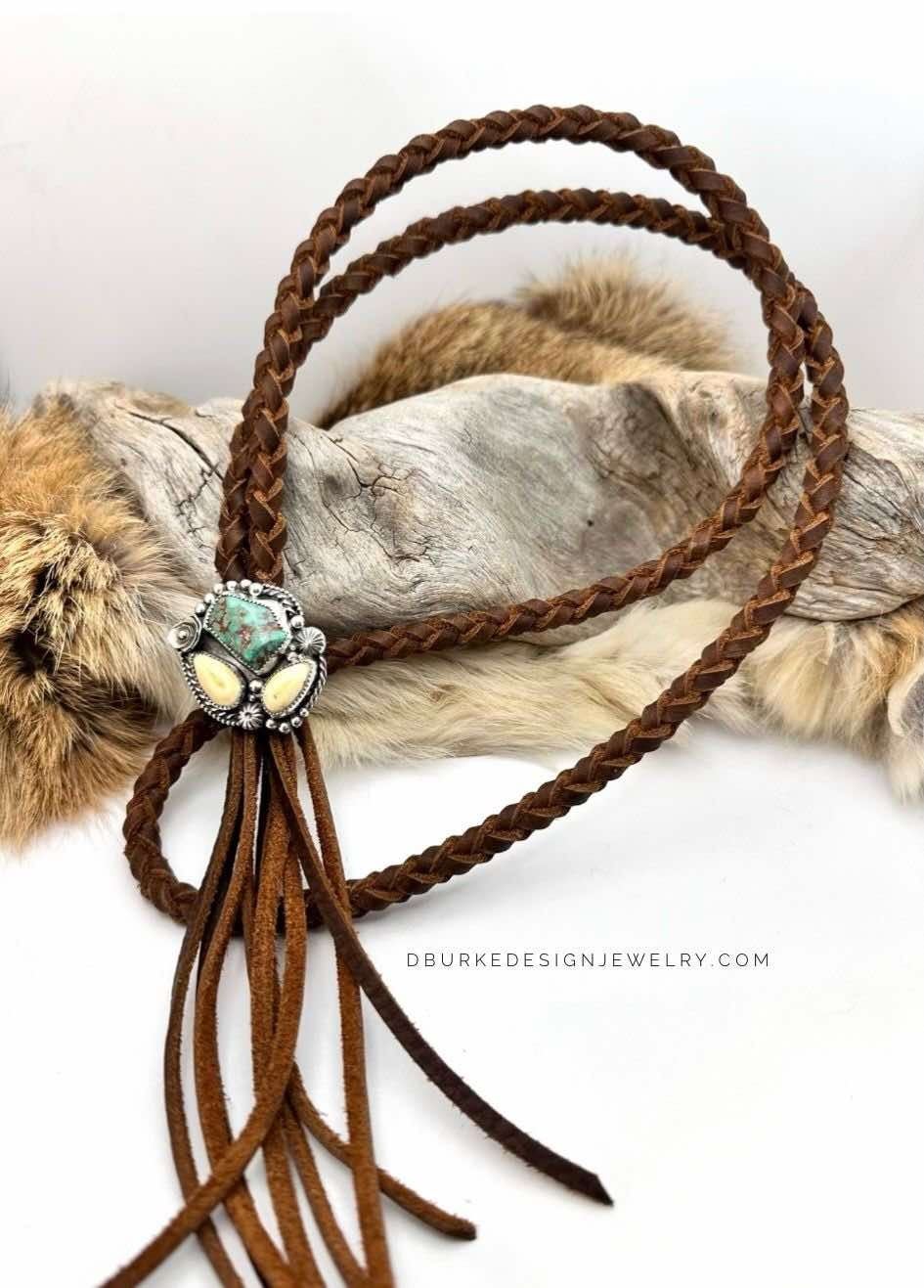Handmade Leather Neck Piece-2 Elk Ivories & Turquoise Inlay in Sterling Silver.