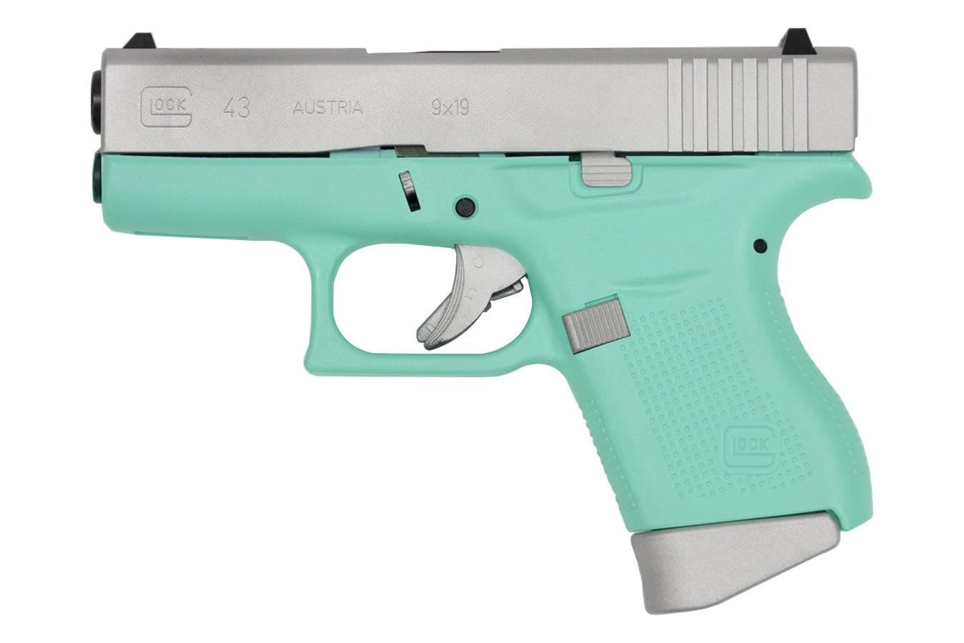 Getting your wife or girlfriend to shoot is difficult enough, but getting her to actually carry her pistol regularly can be even tougher. If you want to ensure that she is always protected from potential harm, it is important that she continues to carry a reliable weapon. That is where the Glock 43 cerakoted in Tiffany Blue comes into play. Featuring a durable polymer design and 3 dot sights, the Glock 43 was made to put up with the most difficult applications. Thanks to continuous fan requests, this pistol includes a single stack magazine design, ensuring a thinner platform and giving shooters the ultimate option for concealed carry. This model features a Tiffany Blue frame finish and a satin aluminum slide, to help you convince your special lady to carry her new pistol. It comes with 2 magazines to ensure you have enough ammo for the job at hand.