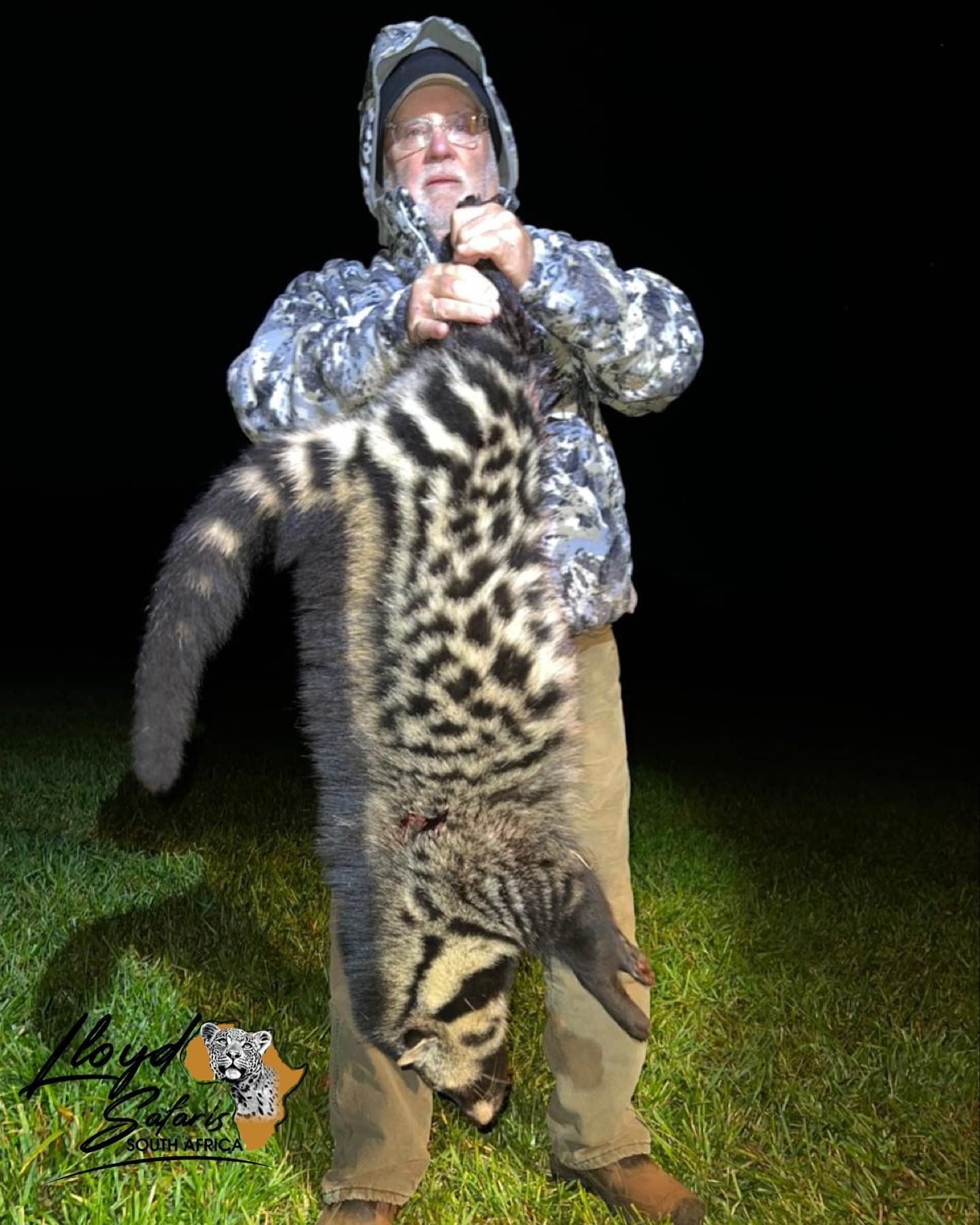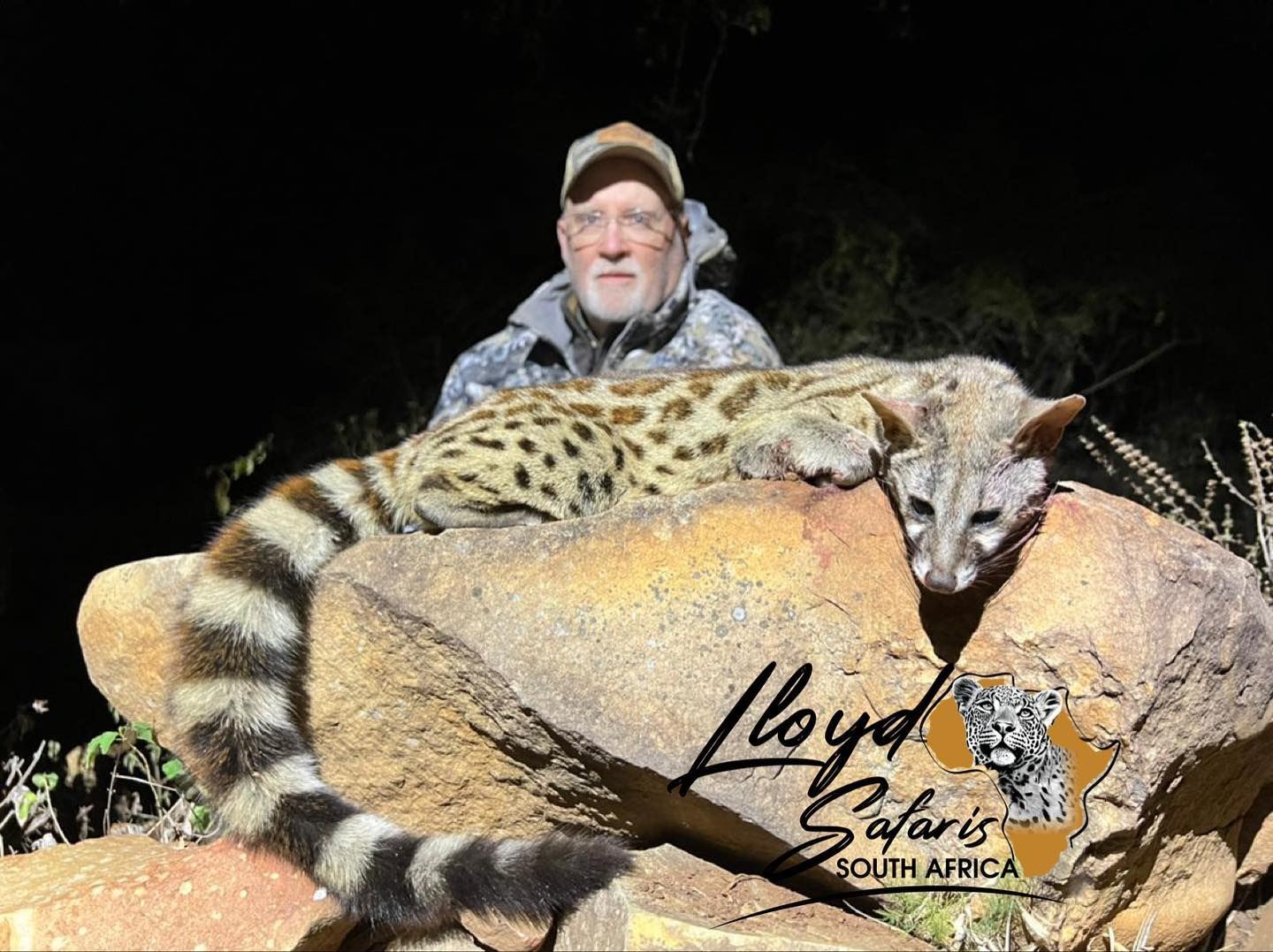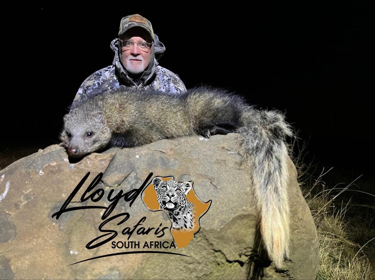 Lloyd Safaris invites one hunter and one non-hunter South Africa for a 7-day Night Safari, 1×1 guided. Available animals unique to the Mpumalanga Province of South Africa include Serval, Caracal, African Wildcat, White-tailed Mongoose, Brown Water Mongoose and Genet. Please note, this is a list of potential animals that can be taken on any given night hunt. Every effort will be made to harvest as many of these animals as possible. If you have a preference for particular animals, please relay this information prior to your hunt. Method of take is hunter's choice; however, rifle hunting is preferred and provides a higher success rate. While on safari, guests will enjoy wonderful accommodations in traditional African chalets and outstanding South African cuisine. Schedule your hunt with the outfitter for open dates in 2025 or 2026. Additional plains game and dangerous game can be arranged during your safari for an additional fee. Included are accommodations, meals, 1×1 guide service, ground transportation during hunt and field preparation. Additional hunters are welcome at the rate of $270/day plus trophy fees and non-hunters are welcome at the rate of $180/day. Hunt can also be extended at the rate of $270/ day or upgraded to include additional species per current pricelist. Hunters are responsible for transportation from the United States to OR TAMBO International Airport in Johannesburg, South Africa, accommodation before/after hunt, firearm permits, dipping, packing/shipping and gratuities. Don’t miss the opportunity to hunt for the “small cats” and unique trophy species in the Mpumalanga Province of South Africa!
