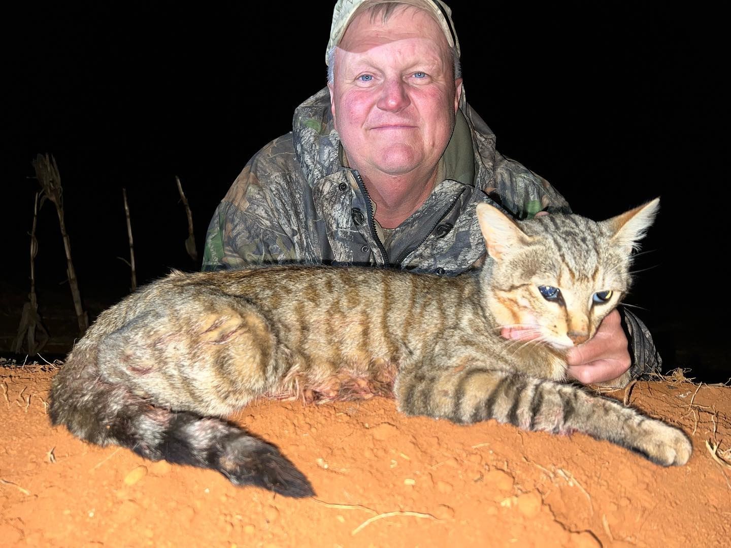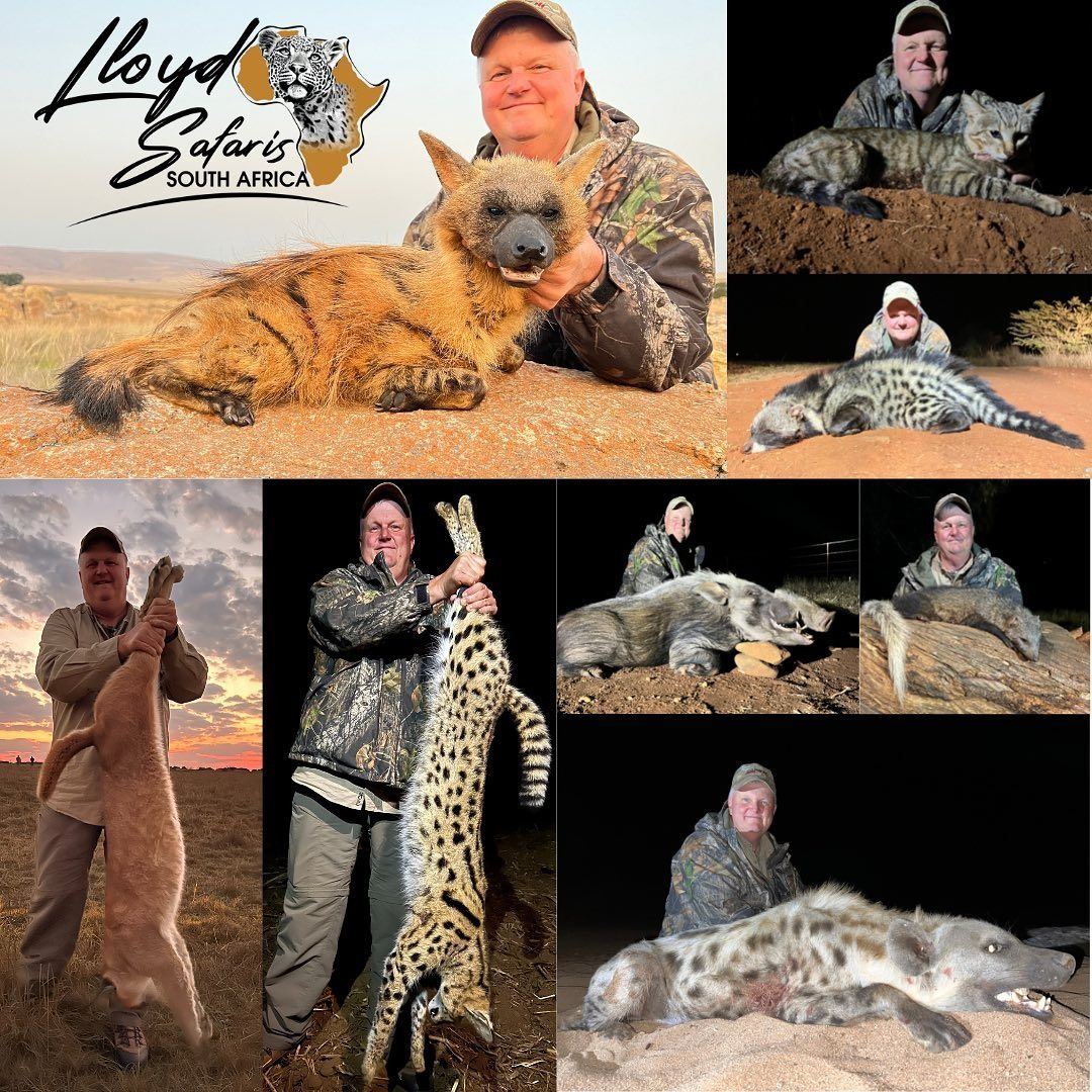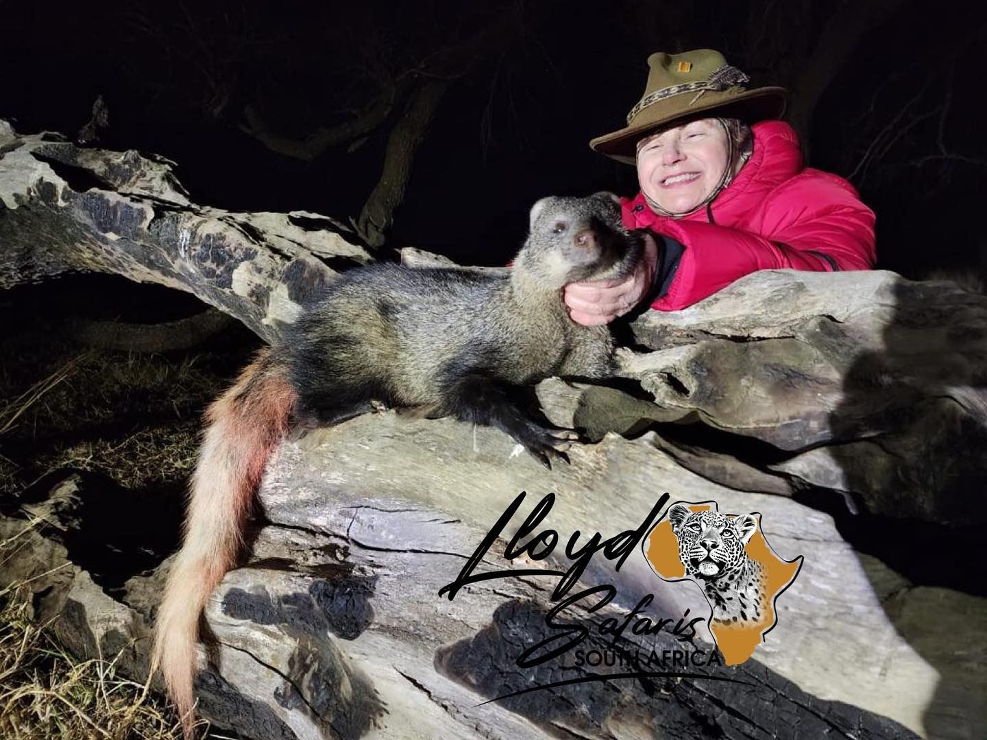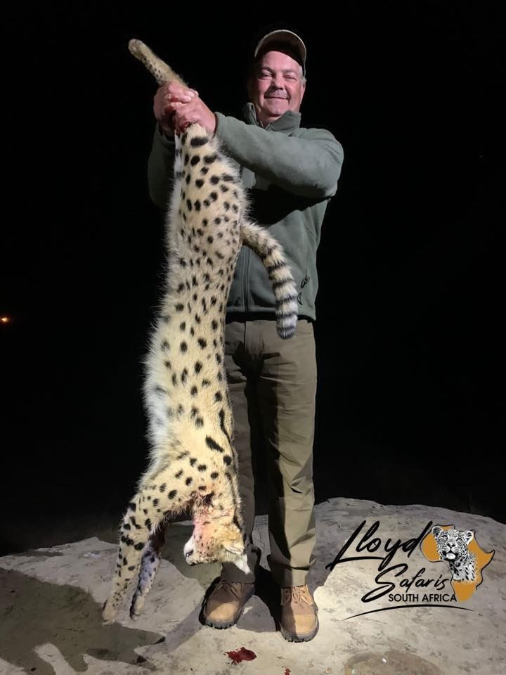 Lloyd Safaris invites one hunter and one non-hunter South Africa for a 7-day Night Safari, 1×1 guided. Available animals unique to the Mpumalanga Province of South Africa include Serval, Caracal, African Wildcat, White-tailed Mongoose, Brown Water Mongoose and Genet. Please note, this is a list of potential animals that can be taken on any given night hunt. Every effort will be made to harvest as many of these animals as possible. If you have a preference for particular animals, please relay this information prior to your hunt. Method of take is hunter's choice; however, rifle hunting is preferred and provides a higher success rate. While on safari, guests will enjoy wonderful accommodations in traditional African chalets and outstanding South African cuisine. Schedule your hunt with the outfitter for open dates in 2025 or 2026. Additional plains game and dangerous game can be arranged during your safari for an additional fee. Included are accommodations, meals, 1×1 guide service, ground transportation during hunt and field preparation. Additional hunters are welcome at the rate of $270/day plus trophy fees and non-hunters are welcome at the rate of $180/day. Hunt can also be extended at the rate of $270/ day or upgraded to include additional species per current pricelist. Hunters are responsible for transportation from the United States to OR TAMBO International Airport in Johannesburg, South Africa, accommodation before/after hunt, firearm permits, dipping, packing/shipping and gratuities. Don’t miss the opportunity to hunt for the “small cats” and unique trophy species in the Mpumalanga Province of South Africa!