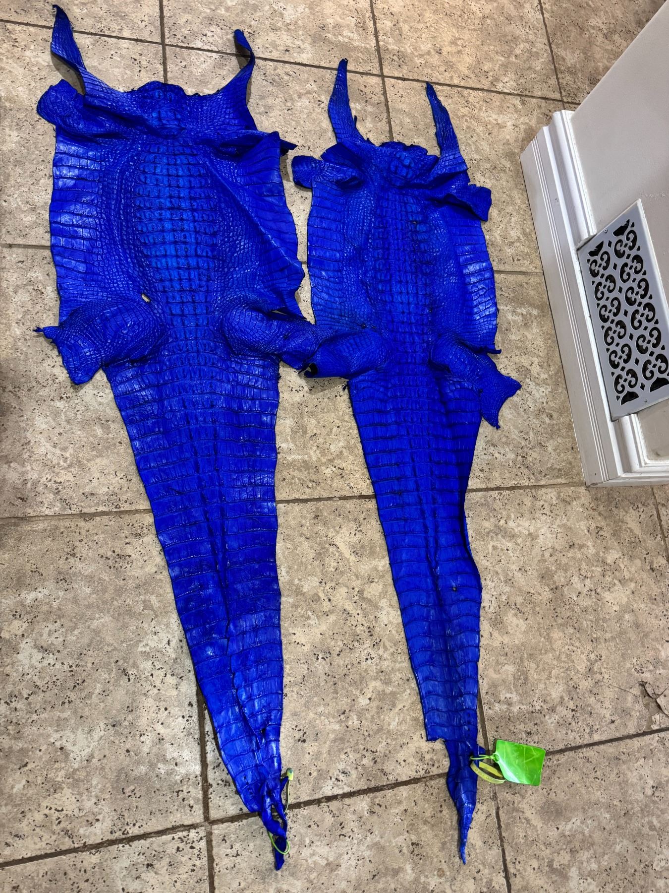 Description: Harvested from Southern Louisiana and professionally skinned, tanned, and dyed these American Alligator hides are a must have to add to your collection. The perfect material to create whatever leather goods you would like or simply to add a trophy or decoration to your home. Soft tanned with a velvet like finish on the underside, this is a stunning conversation piece. The electric blue dyed color is stunning eye catcher! Tanned gator leather hides are perfect for upholstering luggage, furniture, seats, or any item you can dream up! We also have additional hides available to purchase if you need more in bulk! Shipping is not included in this package! Exact hides are pictured here.