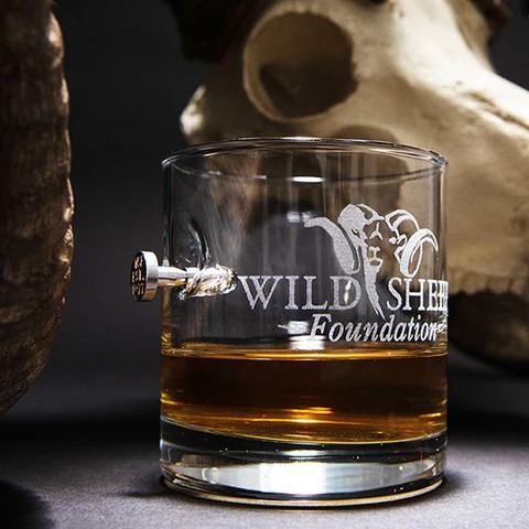 First is a set of 2, horn plug rocks glasses for the sheep hunter who has everything. The actual aluminum wild sheep horn plug is melted into a high-quality rocks glass. Plug reads, WSF EST. 1977